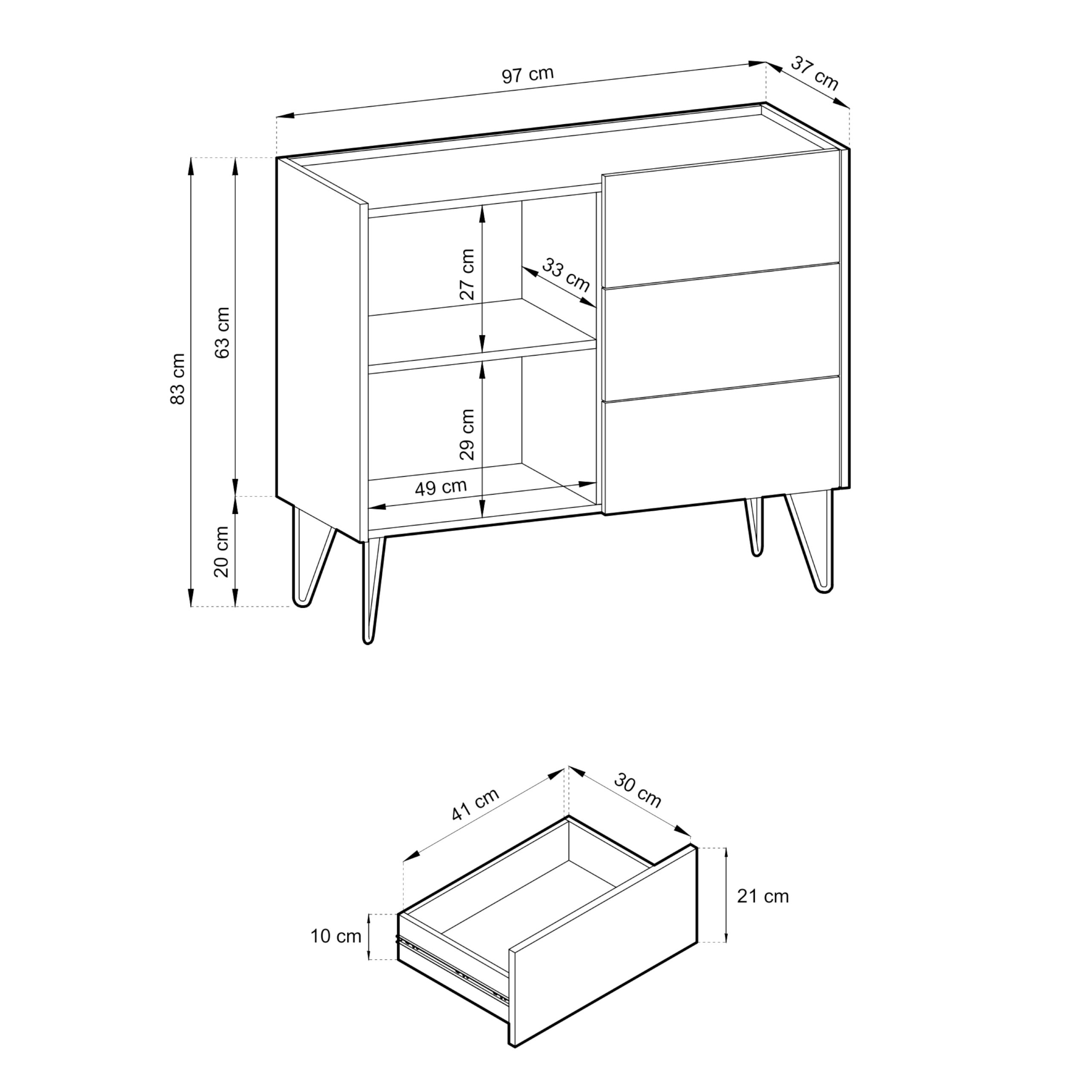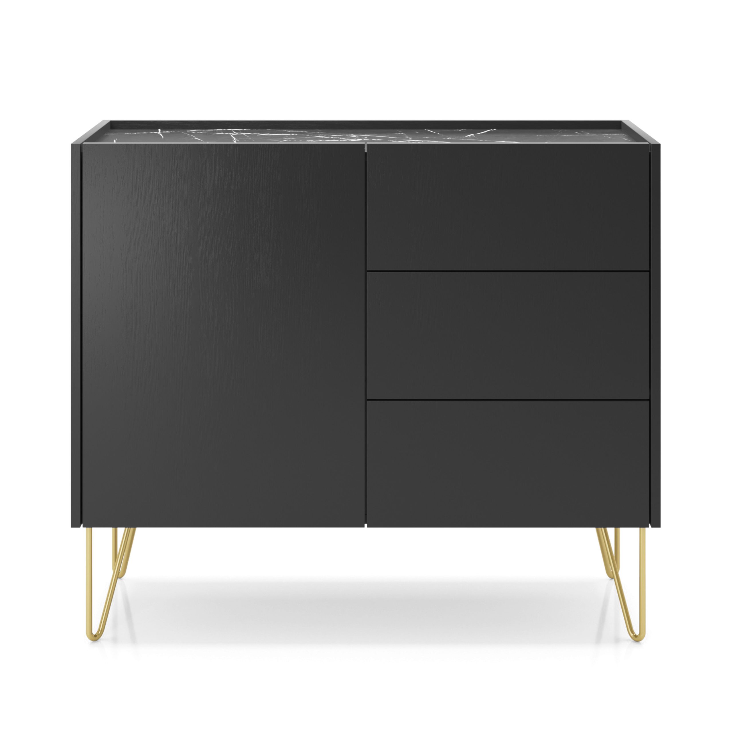 Die Kommode Canmore KSZ-97 ist eine Kombination aus Funktionalität und Eleganz, ideal für stilvoll eingerichtete Innenräume. Ein schwarzer, matter Korpus, eine Marmorplatte und goldene, gebogene Beine im Retro-Stil bilden ein klares und harmonisches Set. Die Kommode bietet praktischen Stauraum in drei geräumigen Schubladen, die mit einem Push-to-open-System ohne sichtbare Griffe geöffnet werden können. Hergestellt aus strapazierfähiger, 16 mm dicker laminierter Platte, versehen mit einer widerstandsfähigen ABS-Kante – gewährleistet eine jahrelange Haltbarkeit. Es ist die perfekte Wahl für alle, die ein Möbelstück suchen, das praktische Funktionen mit origineller Ästhetik verbindet.