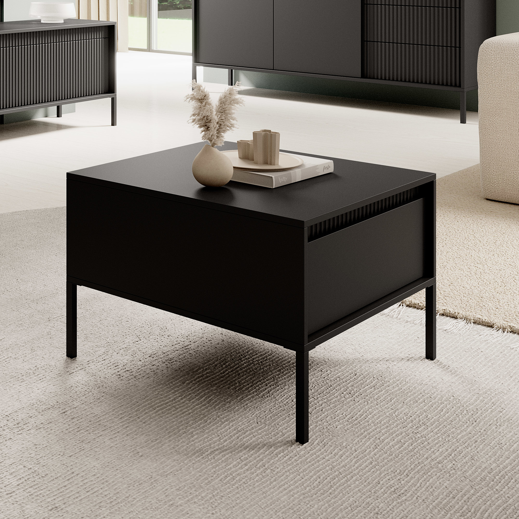 Couchtisch SELBU – Schwarz – geriffelte Fronten – mit Schublade