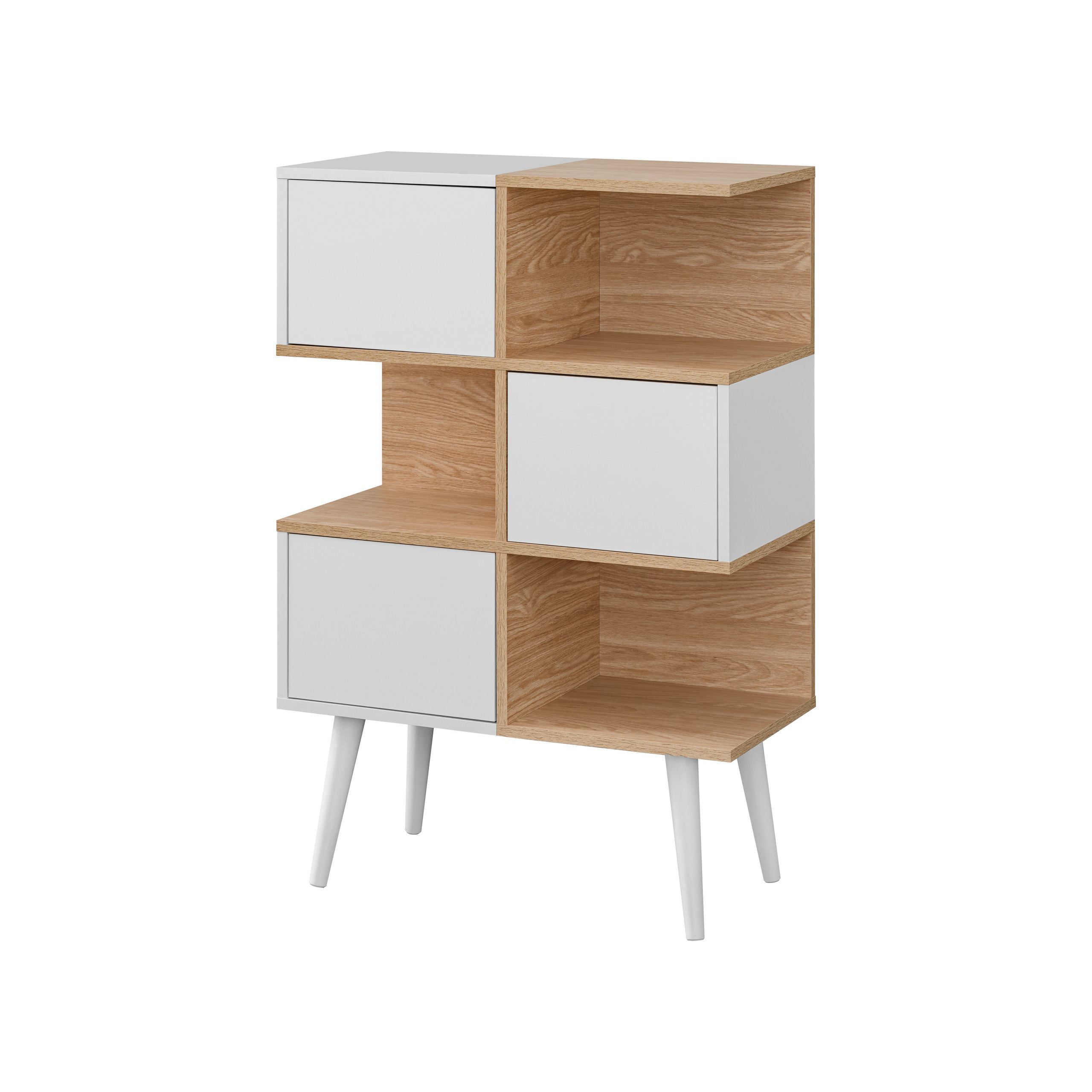 Dank seines universellen Charakters passt das Möbelstück perfekt in skandinavische, industrielle oder moderne Einrichtungskonzepte. Die dezent schrägen, schlanken Retro-Füße, inspiriert von der Ästhetik der 60er- und 70er-Jahre, verleihen dem Ganzen eine subtile Eleganz und unterstreichen die Einheitlichkeit der gesamten Kollektion.