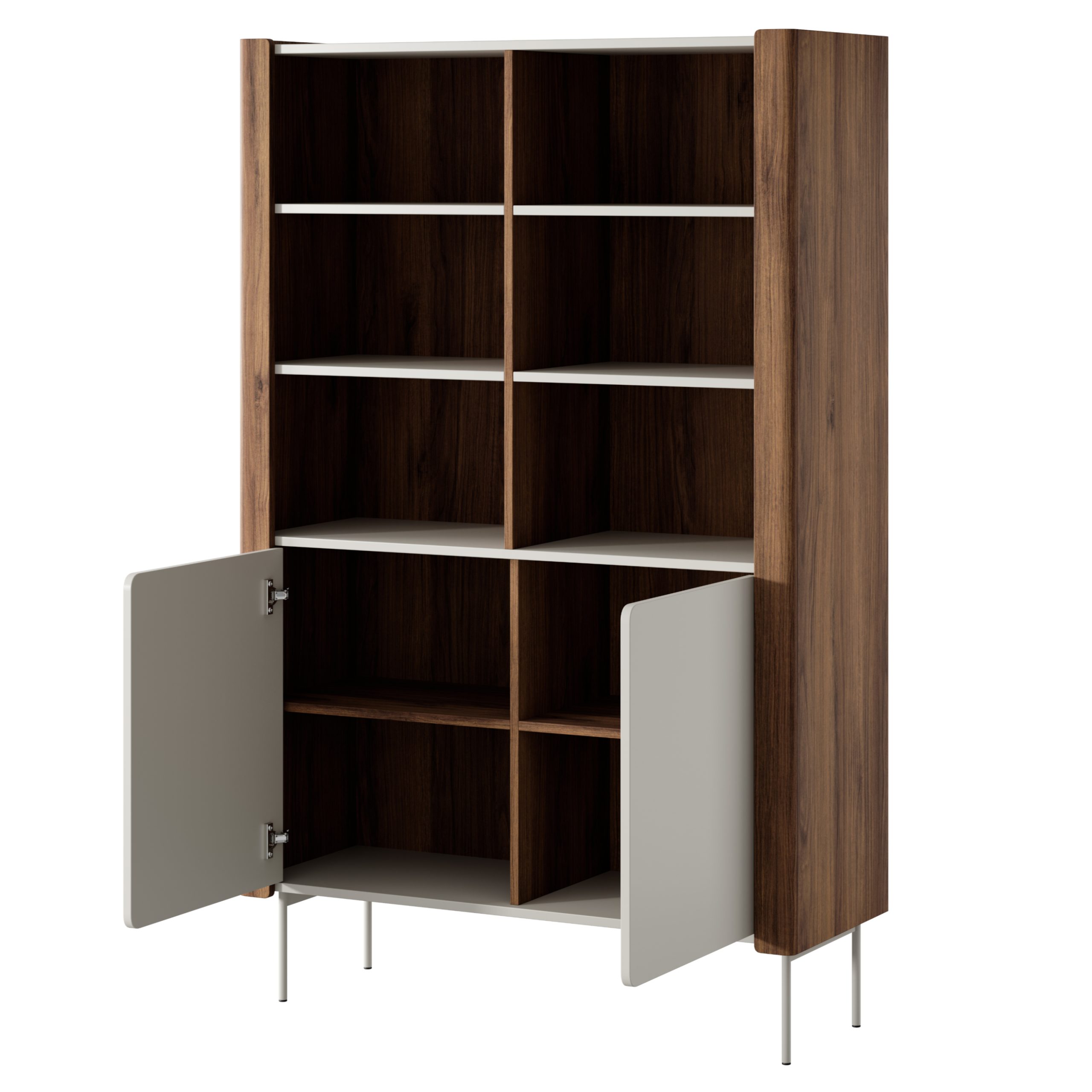 Das Bücherregal Guelph R105 ist ein funktionales Möbelstück mit elegantem Design, ideal für moderne und gemütliche Innenräume. Sein Stil basiert auf der harmonischen Kombination eines warmen Nussbaum-Dekors mit einem matten kaschmirfarbenen Finish. Geometrisch gefräste Fronten verleihen dem Ganzen eine subtile Dynamik, und offene Regale ermöglichen die effektvolle Präsentation von Büchern, Dekorationen oder Porzellan. Der geschlossene Teil bietet Platz für die Aufbewahrung von weniger ansehnlichen Gegenständen. Die stabile Struktur wird von schlanken, schwarzen Beinen getragen, die den Möbeln Leichtigkeit und Klasse verleihen.