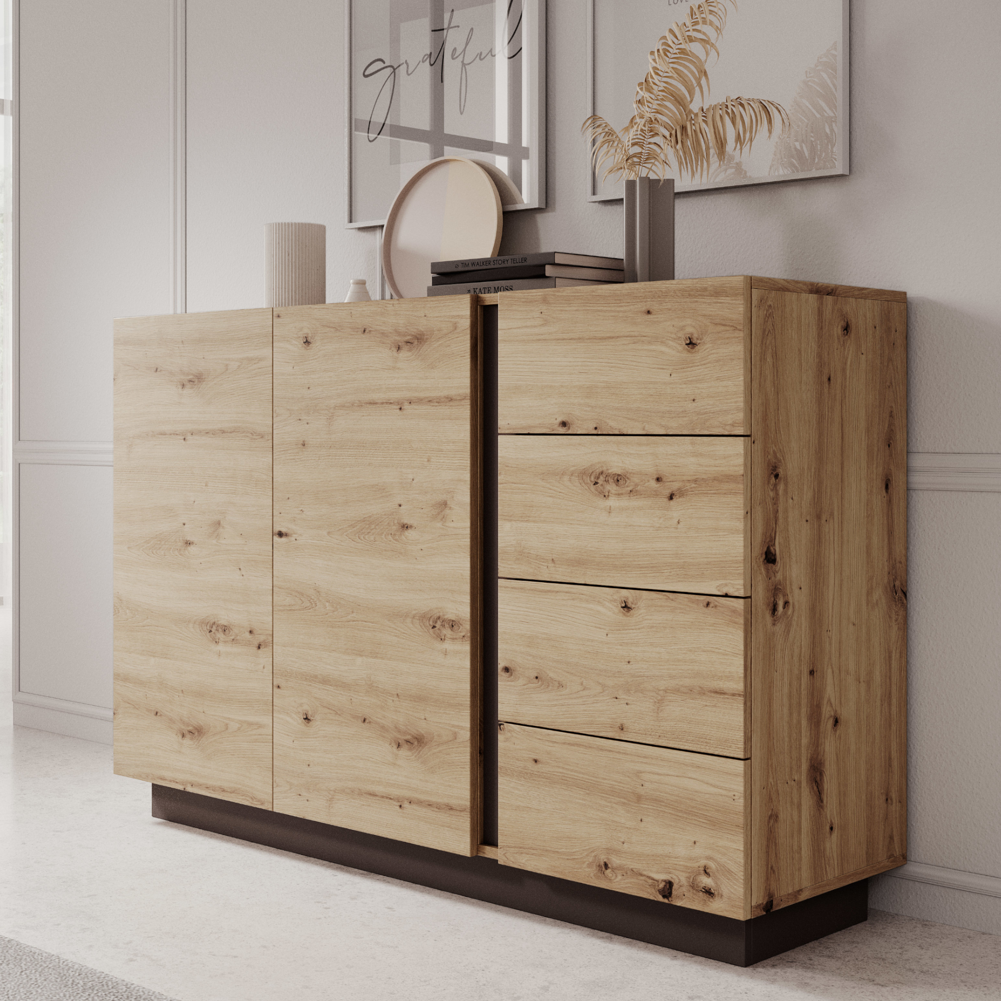 Die Möbelkollektion ANDEBU ist eine ideale Wahl für alle, die natürliche Holz­wärme in einer modernen Form in ihr Zuhause bringen möchten. Die harmonische Kombination von eicheninspirierten Dekoren mit kontrastierenden, dezenten Farbtönen schafft ein elegantes und ausdrucksstarkes Gesamtbild – perfekt für zeitgemäße Wohnzimmer und Wohnbereiche.