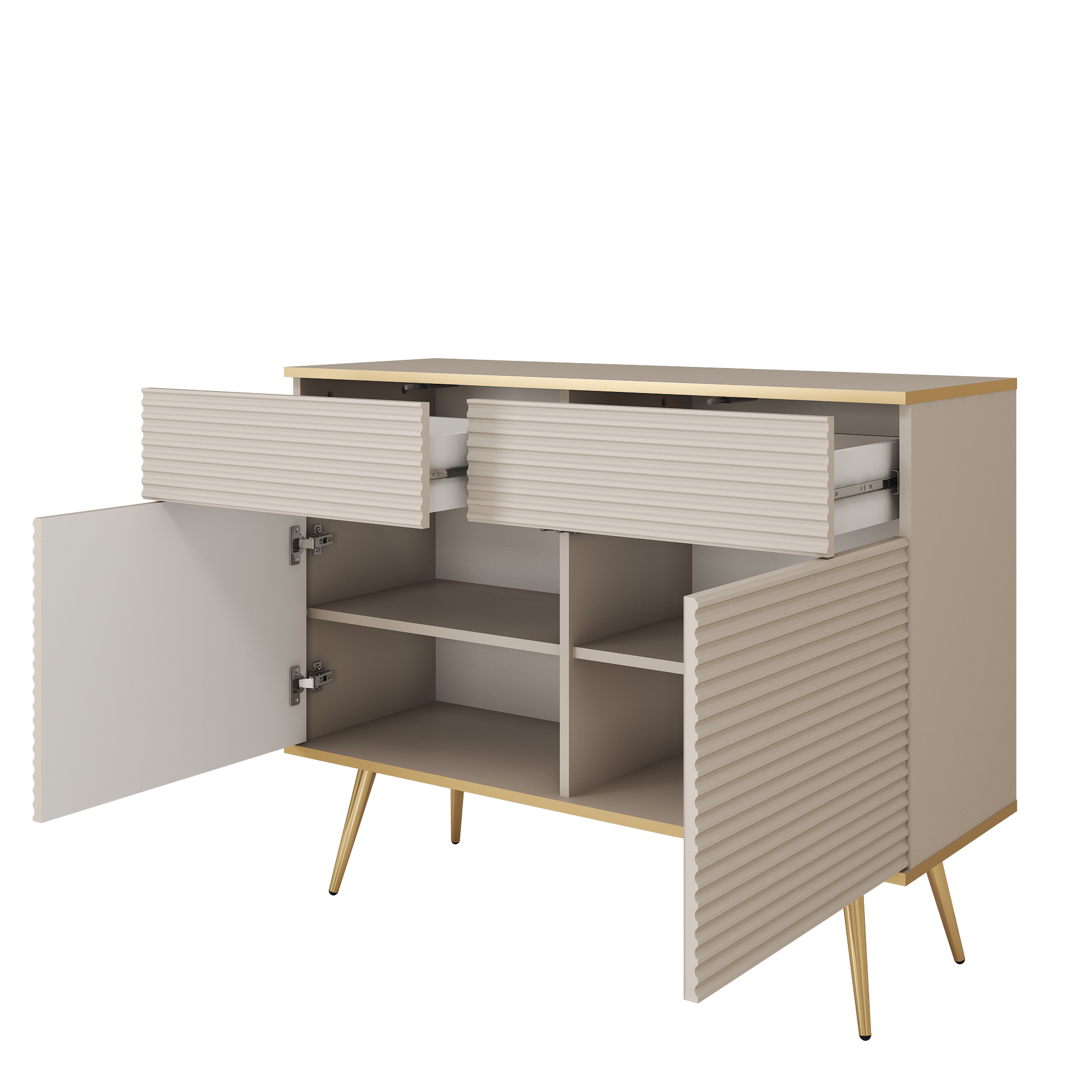 Kommode Banff KSZ107 MDF – Beige – Goldene Beine – Geriffelte Fronten – 2 Schubladen – Breite 107 cm, Höhe 85 cm, Tiefe 39 cm