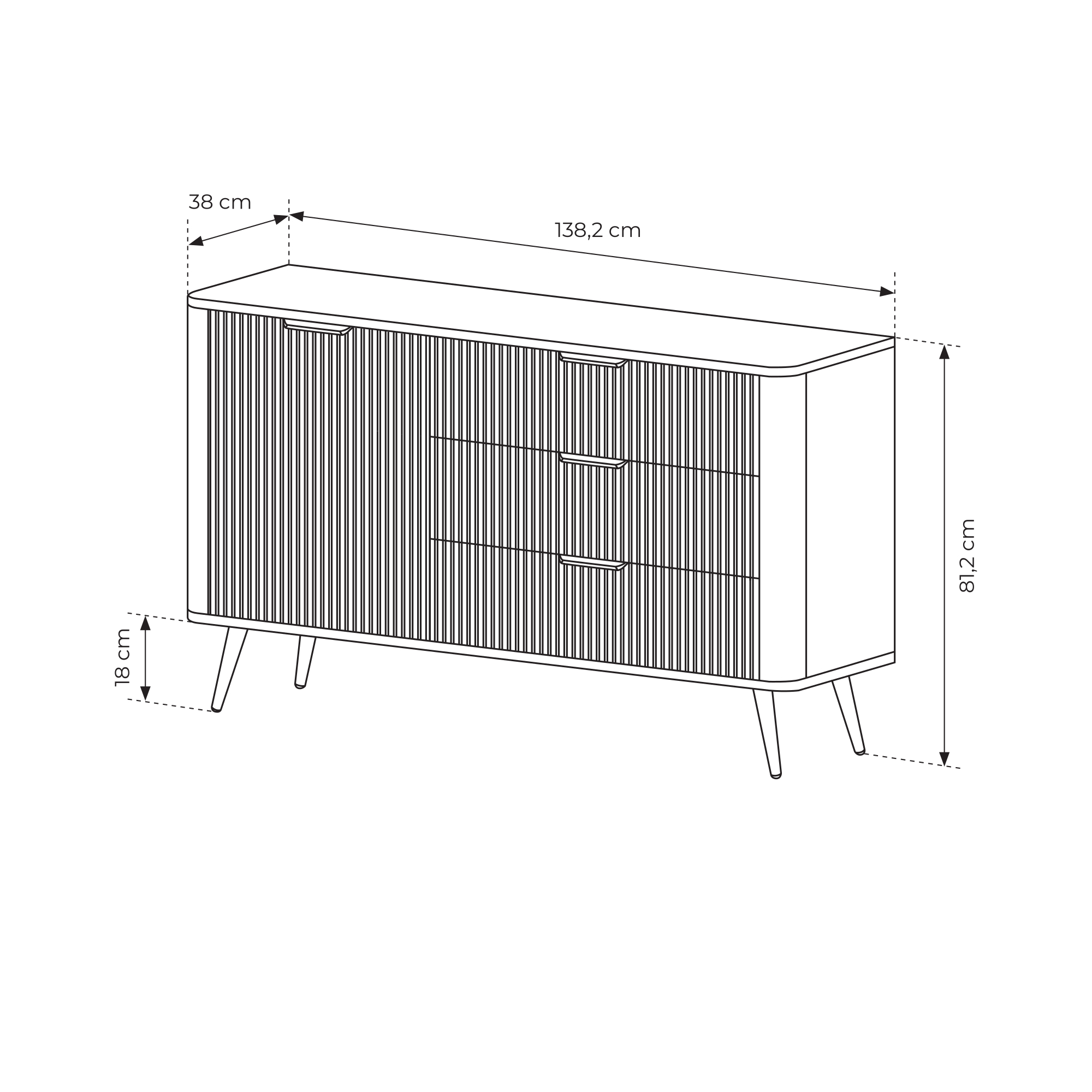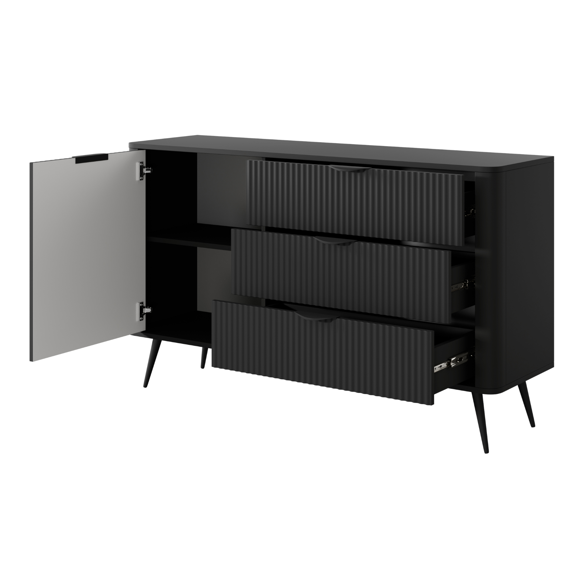 Abgerundete Kanten sowie geriffelte Fronten sorgen für ein ausdrucksstarkes und zugleich zurückhaltendes Design, das die Aufmerksamkeit auf sich zieht und den charakteristischen Stil der Kollektion unterstreicht. Dabei wurde besonderer Wert darauf gelegt, dass die Möbel nicht nur optisch überzeugen, sondern auch funktional sind – durchdachte Innenaufteilungen bieten praktischen Stauraum, der den Anforderungen des Alltags gerecht wird.