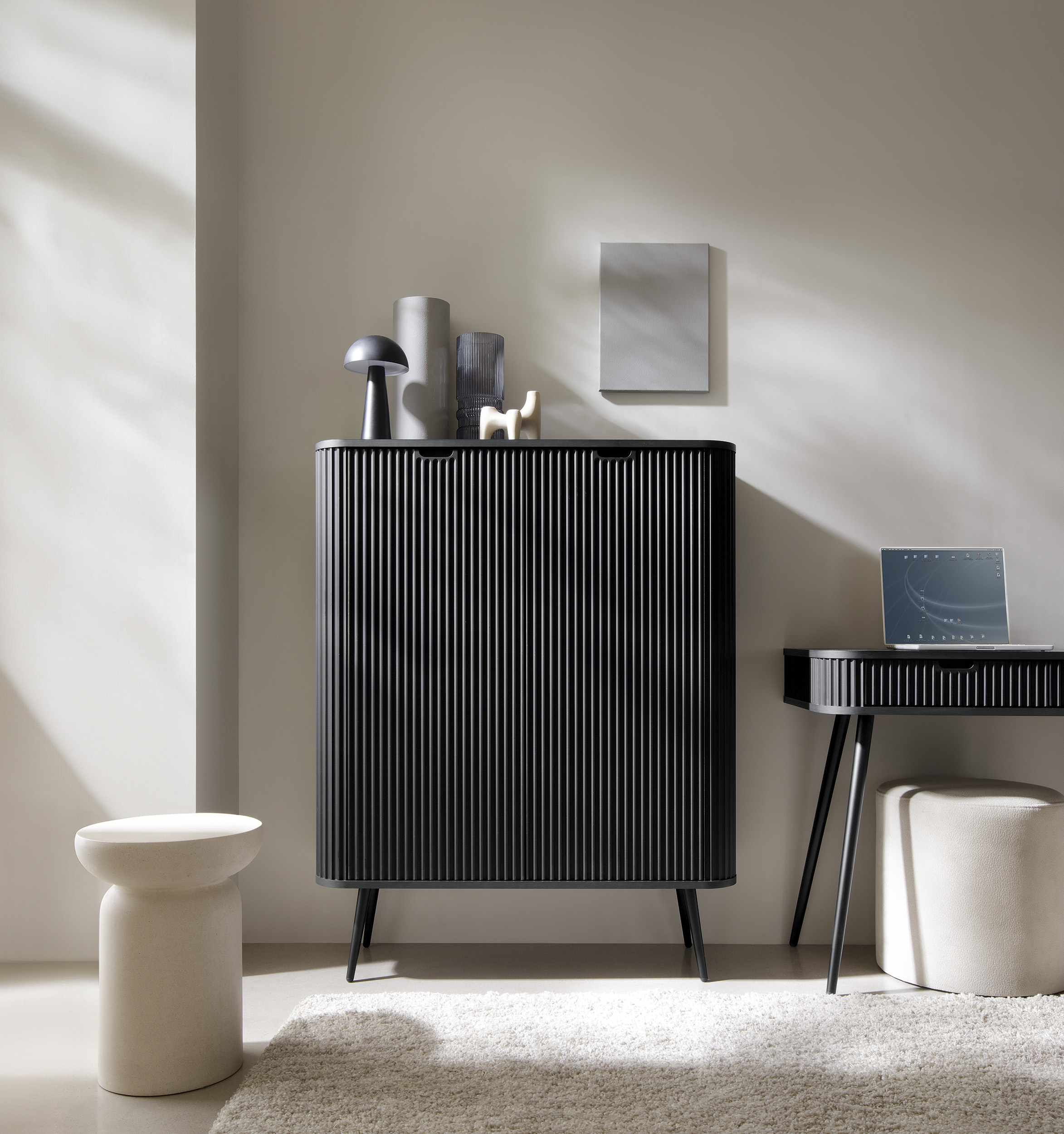 Hohe Kommode Morden – Eleganz und Modernität in einem. Sie suchen ein Möbel, das nicht nur praktisch, sondern auch spektakulär und designorientiert ist? Die Kollektion Morden erfüllt die Erwartungen all jener, die Modernität, Leichtigkeit und außergewöhnliche Formen schätzen. Diese hohe Kommode verbindet eine minimalistische Silhouette mit raffinierten Details, die den Blick auf sich ziehen und eine besondere Atmosphäre im Raum schaffen. Abgerundete Kanten lassen den Korpus leicht und dezent wirken und bewahren gleichzeitig seinen modernen Charakter. Mit Rillen verzierte Fronten verleihen Tiefe und unterstreichen den Designer-Stil des Möbels. Eine perfekte Lösung für trendige Interieurs – vom eleganten Minimalismus bis hin zu Modern Classic. Gefertigt aus hochwertiger, laminierter Platte und MDF, überzeugt das Möbel durch Langlebigkeit, Widerstandsfähigkeit im täglichen Gebrauch und einen dauerhaft gepflegten Look. ABS-Kanten verstärken die Konstruktion und schützen sie vor Stößen. Die Kommode steht auf schlanken Metallfüßen in Schwarz, die Stabilität, optische Leichtigkeit und Modernität bieten. Hinter den gefrästen Fronten verbergen sich praktische Fächer mit Einlegeböden, ideal zur Aufbewahrung von Dokumenten, Accessoires, Textilien oder anderen Kleinigkeiten. So vereint das Möbel ausdrucksstarkes Design und hohe Funktionalität. Dezent integrierte, gefräste Griffe erleichtern das Öffnen und sind zugleich ein elegantes Dekordetail. Metalla-Scharniere gewährleisten ein leises, sanftes Schließen der Türen. Die Kommode Morden ist in drei Farbvarianten erhältlich – Schwarz, Weiß und Kaschmir – und lässt sich so leicht an Ihren Einrichtungsstil anpassen.