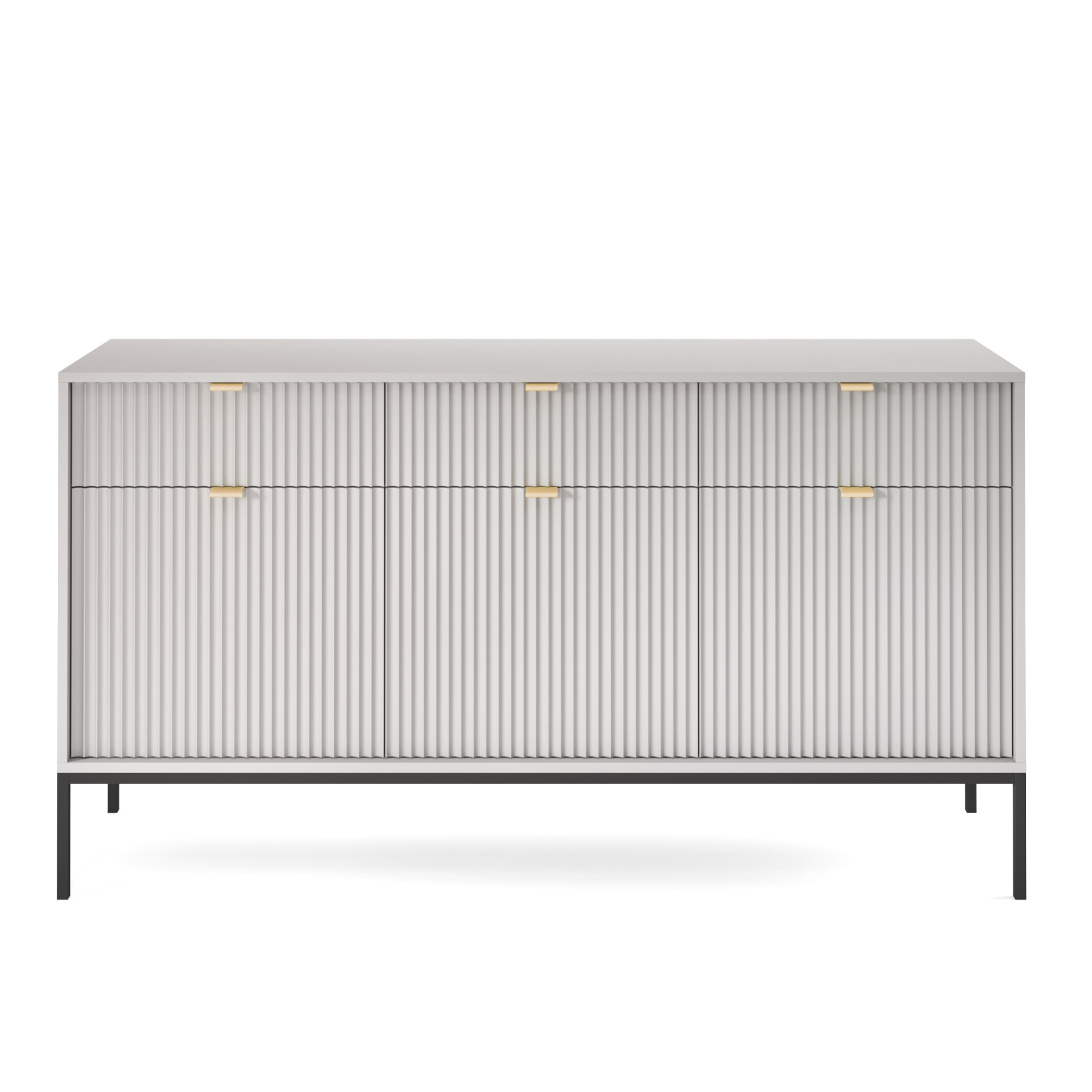 Das Möbelstück zeichnet sich durch geriffelte Fronten, ein geometrisches Stahlgestell und elegante Griffe aus gebürstetem Aluminium aus, die die Blicke auf sich ziehen und dem Ganzen einen einzigartigen Charakter verleihen. Die Kommode ist in 5 trendigen Farben erhältlich: Cashmere, Weiß, Grün, Schwarz und Grau, was es einfach macht, sie in die Raumgestaltung zu integrieren.