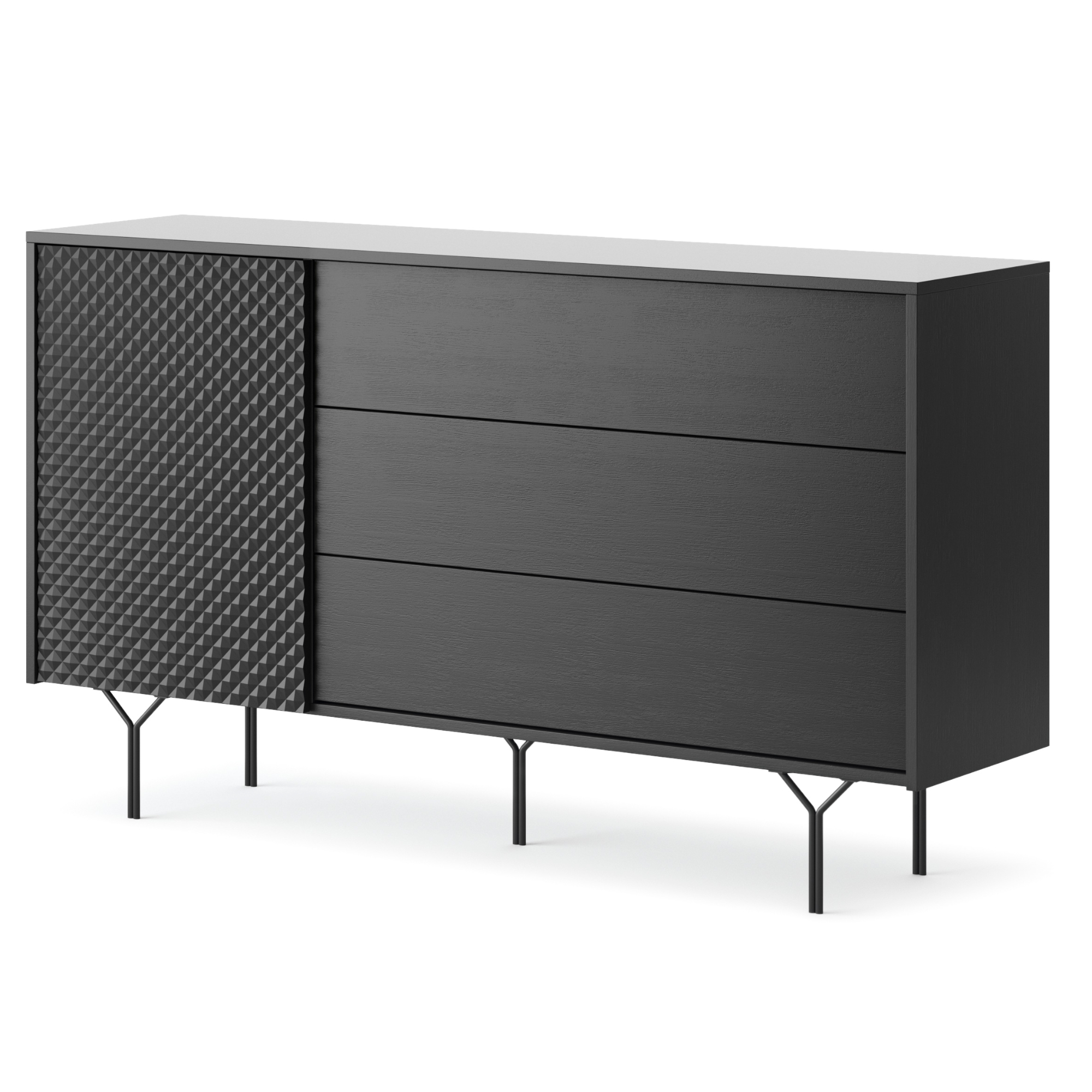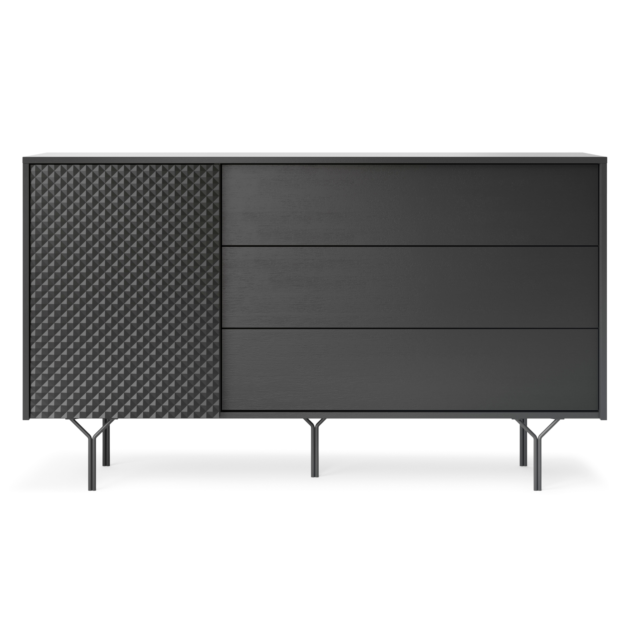 Auf der glatten, schwarzen Tischplatte kannst du Dekorationen, Lieblingspflanzen oder Reiseandenken perfekt präsentieren und die Kommode zum zentralen Punkt deiner Einrichtung machen. Ihr außergewöhnlicher Charakter wird durch die gefräste Front aus 18 mm MDF und die schlanken, stahlfüße mit einem Profil von 10×20 mm hervorgehoben, die der Konstruktion Leichtigkeit und Eleganz verleihen.