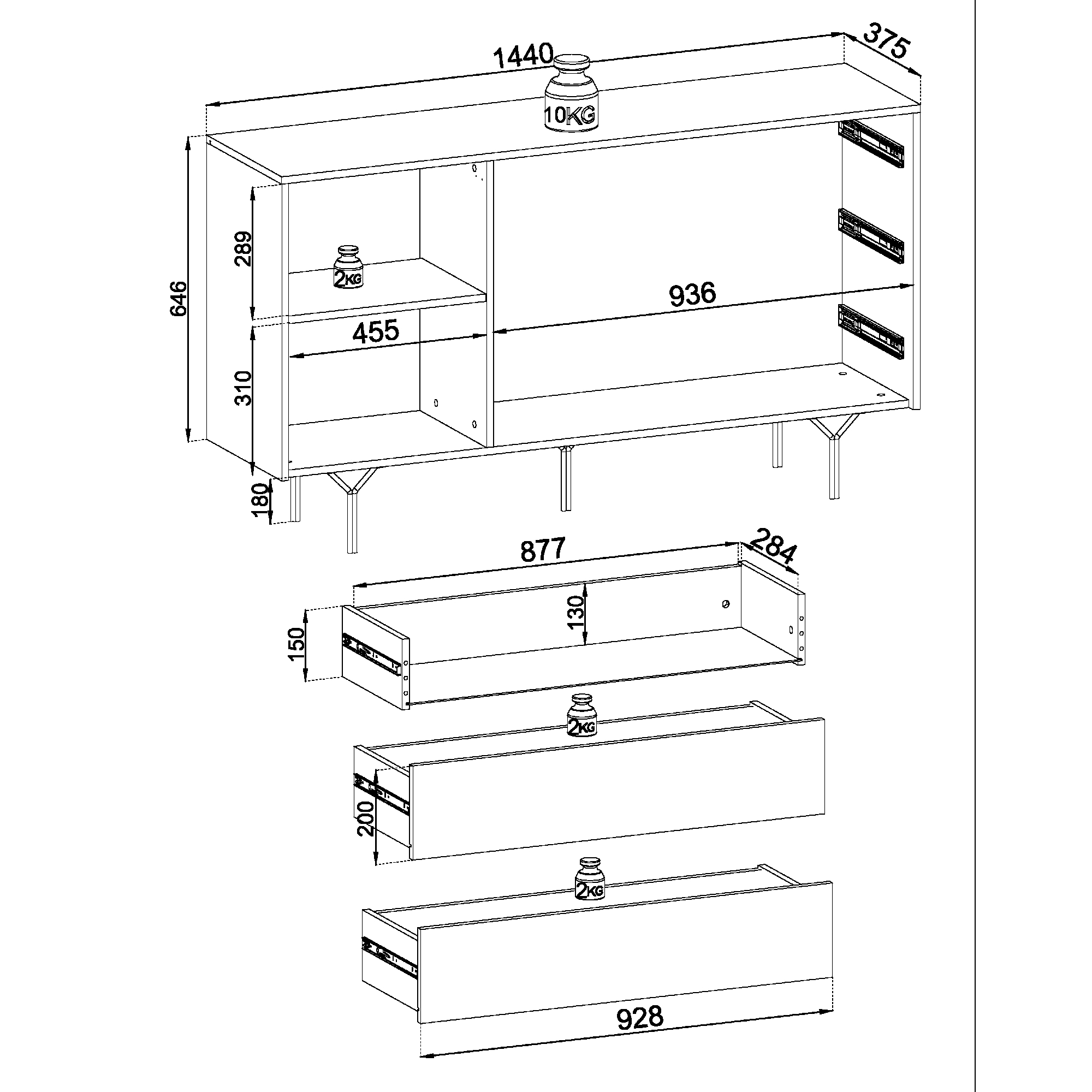 Ausgestattet mit einem geschlossenen Schrank mit Regal und drei geräumigen Schubladen bietet die Kommode ORILLIA viele Aufbewahrungsmöglichkeiten – von Dokumenten und Textilien bis hin zu Geschirr oder täglichen Accessoires. Mit dieser Anordnung kannst du mühelos all deine Dinge sortieren und Harmonie und Ordnung im Raum bewahren.