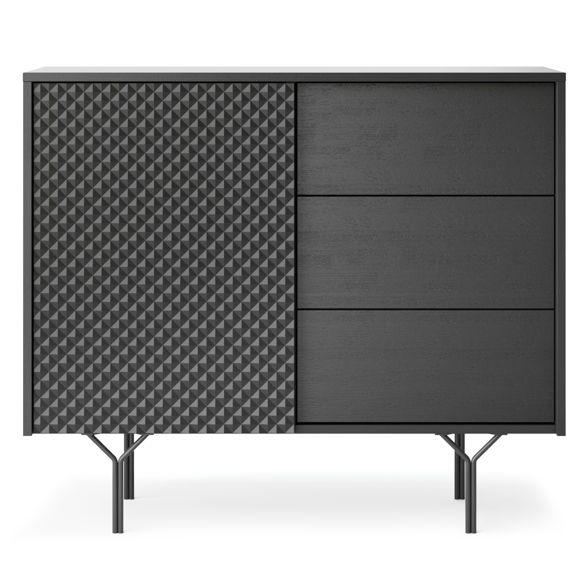 Auf der glatten, schwarzen Tischplatte kannst du Dekorationen, Lieblingspflanzen oder Reiseandenken perfekt präsentieren und die Kommode zum zentralen Punkt deiner Einrichtung machen. Ihr außergewöhnlicher Charakter wird durch die gefräste Front aus 18 mm MDF und die schlanken, stahlfüße mit einem Profil von 10×20 mm hervorgehoben, die der Konstruktion Leichtigkeit und Eleganz verleihen.