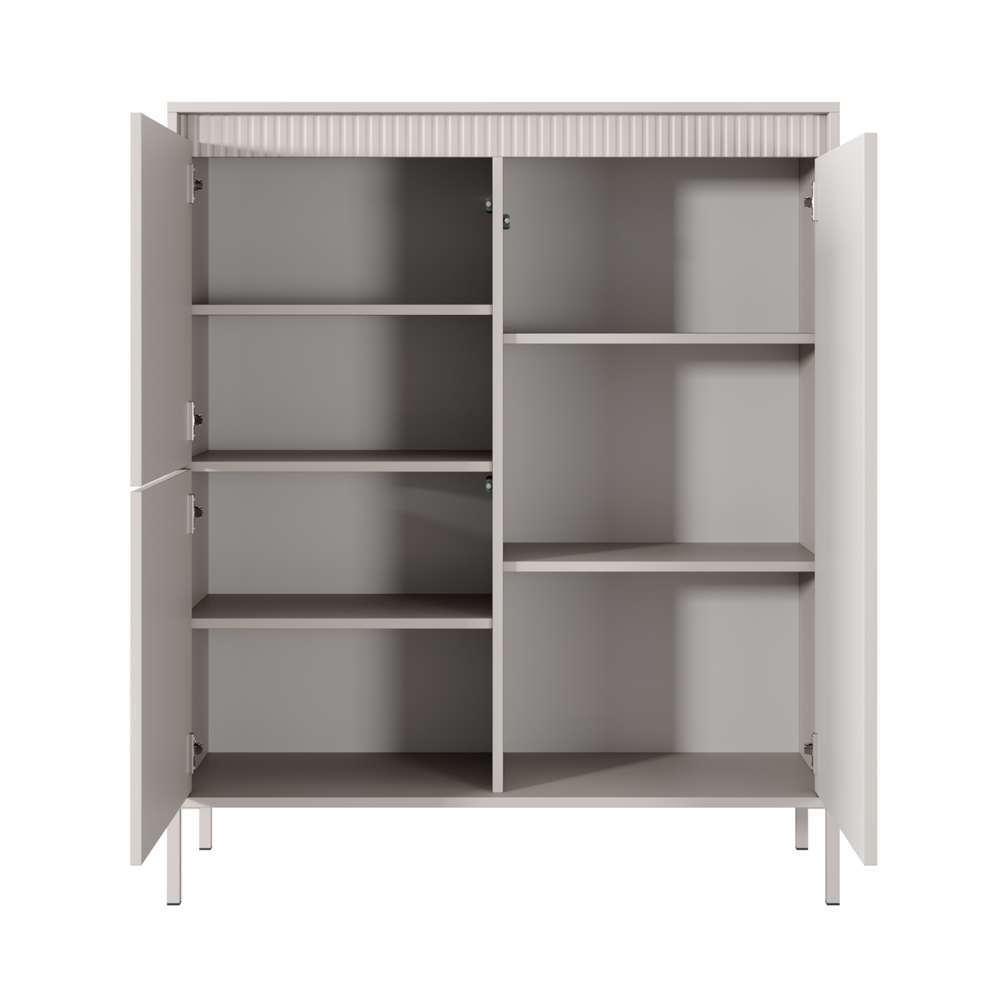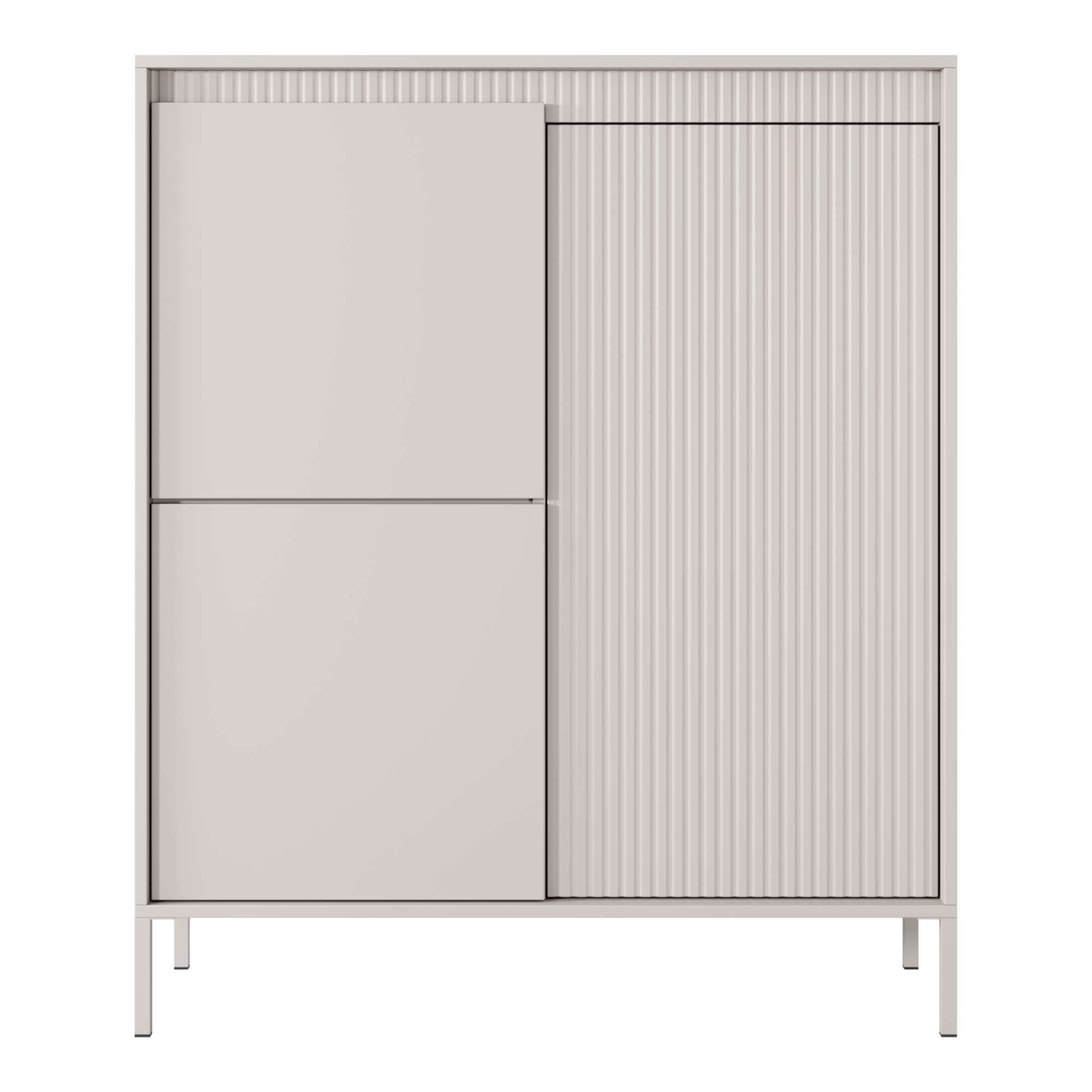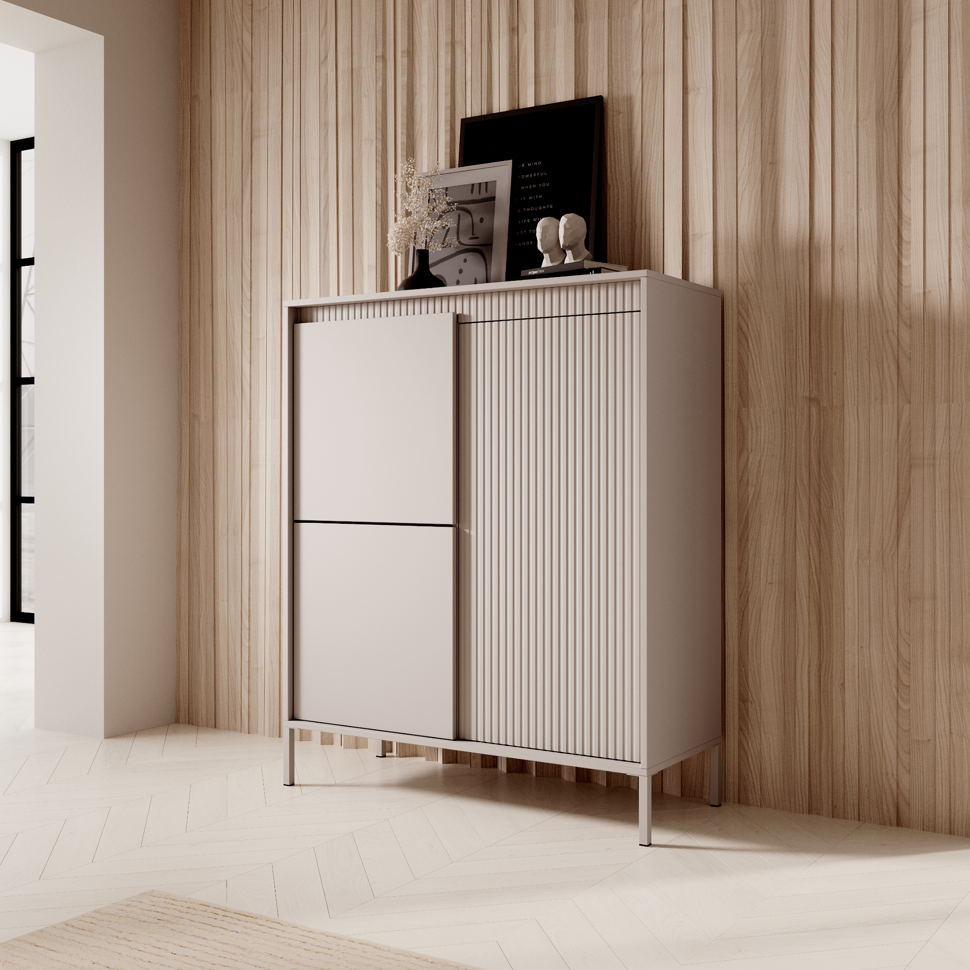 Das grifflose Push-to-open-System unterstreicht den minimalistischen Charakter der Kollektion, während farblich passend lackierte Metallfüße dem Gesamtbild eine optische Leichtigkeit verleihen. Durchdachte Innenaufteilungen bieten praktischen Stauraum, sodass sich die Kollektion SELBU ideal für Wohnzimmer, Schlafzimmer, Essbereich oder den Wohnraum eignet.