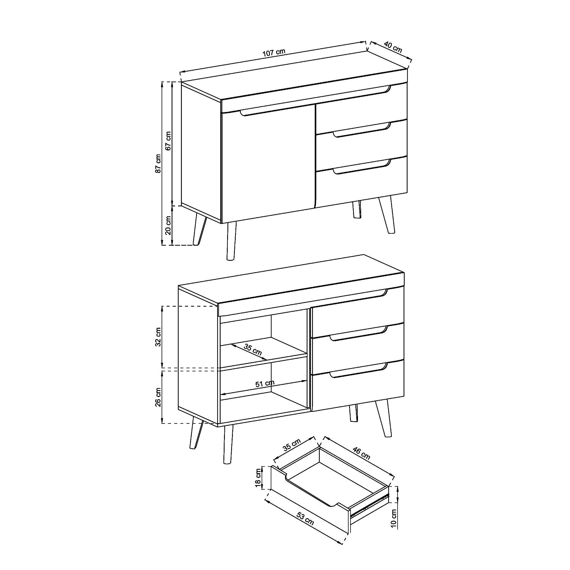 Ausgestattet mit drei geräumigen Schubladen und einem Schrank mit einem Regal bietet er viel Platz für Kleidung, Accessoires, Dokumente oder Tischgeschirr. Die einfache, elegante Form und die schlanken Beine lassen das Möbelstück leicht und stilvoll wirken. Es ist eine universelle Wahl, die sowohl ins Wohnzimmer, Schlafzimmer als auch in den Flur passt.
