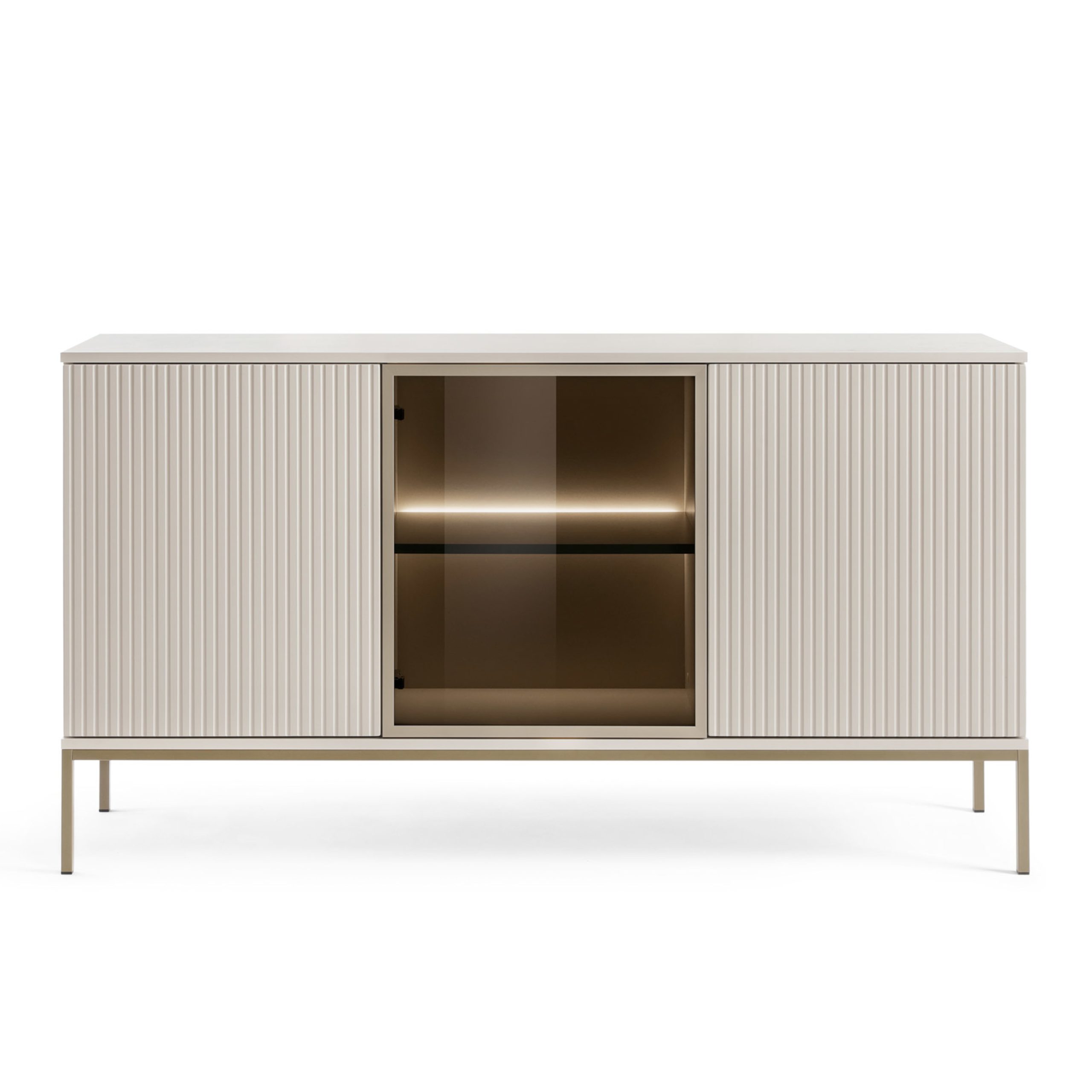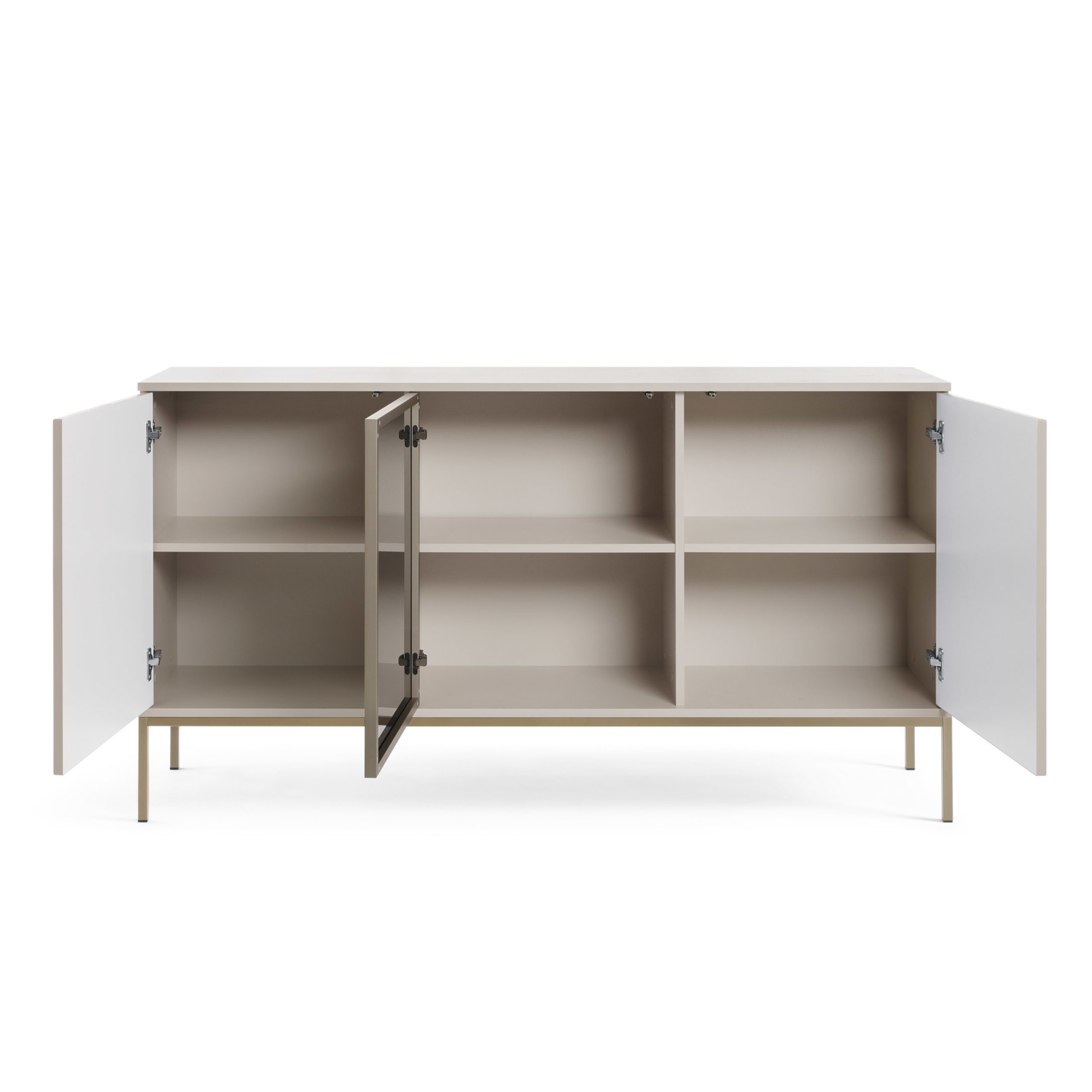 Die Kommode Laval K154 ist ein Möbelstück, das für moderne und Loft-Innenräume geschaffen wurde. Das großzügige kaschmirfarbene Design wurde durch dekorative Lamellen auf der Vorderseite ergänzt, die dem Ganzen einen eleganten Charakter verleihen. Das dreitürige Layout mit einem Push-to-open-System ermöglicht eine komfortable und ästhetische Nutzung ohne sichtbare Griffe. Im Inneren der Kommode verbergen sich zahlreiche Einlegeböden, in denen Dokumente, Geschirr oder Heimtextilien Platz finden. Es ist eine funktionale und stilvolle Lösung für das Wohnzimmer, Esszimmer oder den Flur.