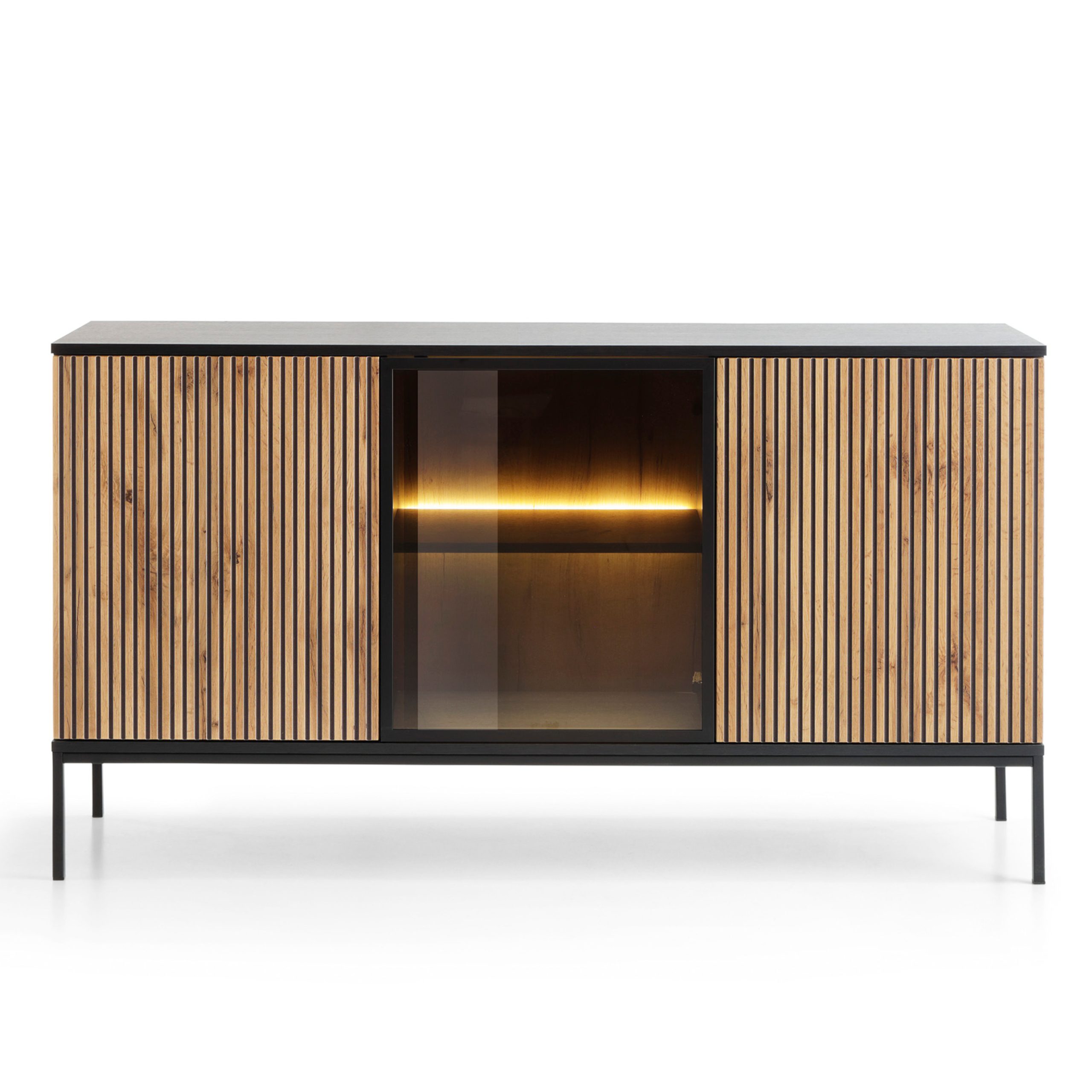 Die Kommode Laval K154 ist ein Möbelstück, das für moderne und Loft-Innenräume geschaffen wurde. Das großzügige Design aus Wotan-Eiche wird durch schwarze Akzente und Zierlamellen an der Front ergänzt, was dem Ganzen einen eleganten Charakter verleiht. Das dreitürige Layout mit einem Push-to-open-System ermöglicht eine komfortable und ästhetische Nutzung ohne sichtbare Griffe. Im Inneren der Kommode verbergen sich zahlreiche Einlegeböden, in denen Dokumente, Geschirr oder Heimtextilien Platz finden. Es ist eine funktionale und stilvolle Lösung für das Wohnzimmer, Esszimmer oder den Flur.