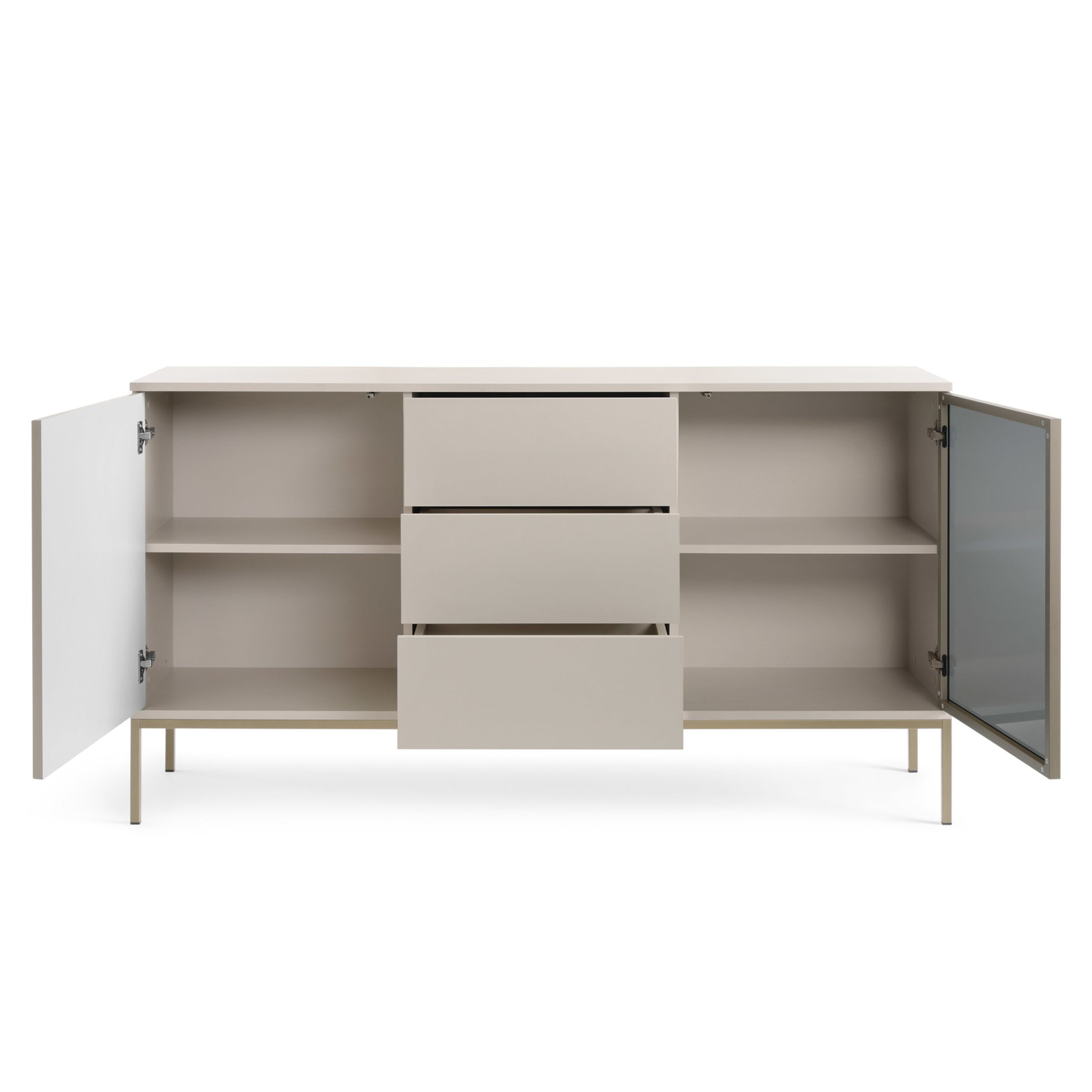 Die Kommode Laval KSZ154 ist ein ideales Angebot für Liebhaber des Loft-Stils und der modernen Einfachheit. Dem kaschmirfarbenen Dekor stehen Fronten gegenüber, die mit einer eleganten, vertikalen Lamelle verziert sind. Das minimalistische Design wurde durch ein Push-to-Open-System ergänzt, das Griffe überflüssig macht und gleichzeitig eine komfortable Nutzung gewährleistet. Vier praktische Schubladen und ein Seitenschrank bieten ausreichend Stauraum. Die hohen, goldenen Beine verleihen dem Gebäude Leichtigkeit und erleichtern die Reinigung. Der Laval KSZ154 eignet sich perfekt für das Wohnzimmer, Schlafzimmer oder das moderne Büro.