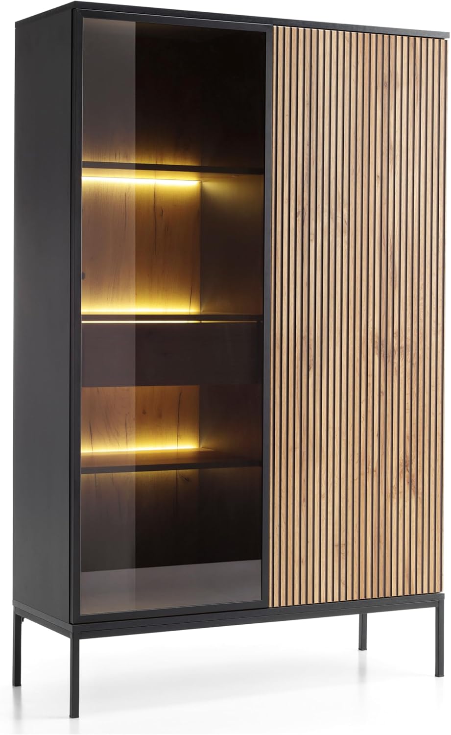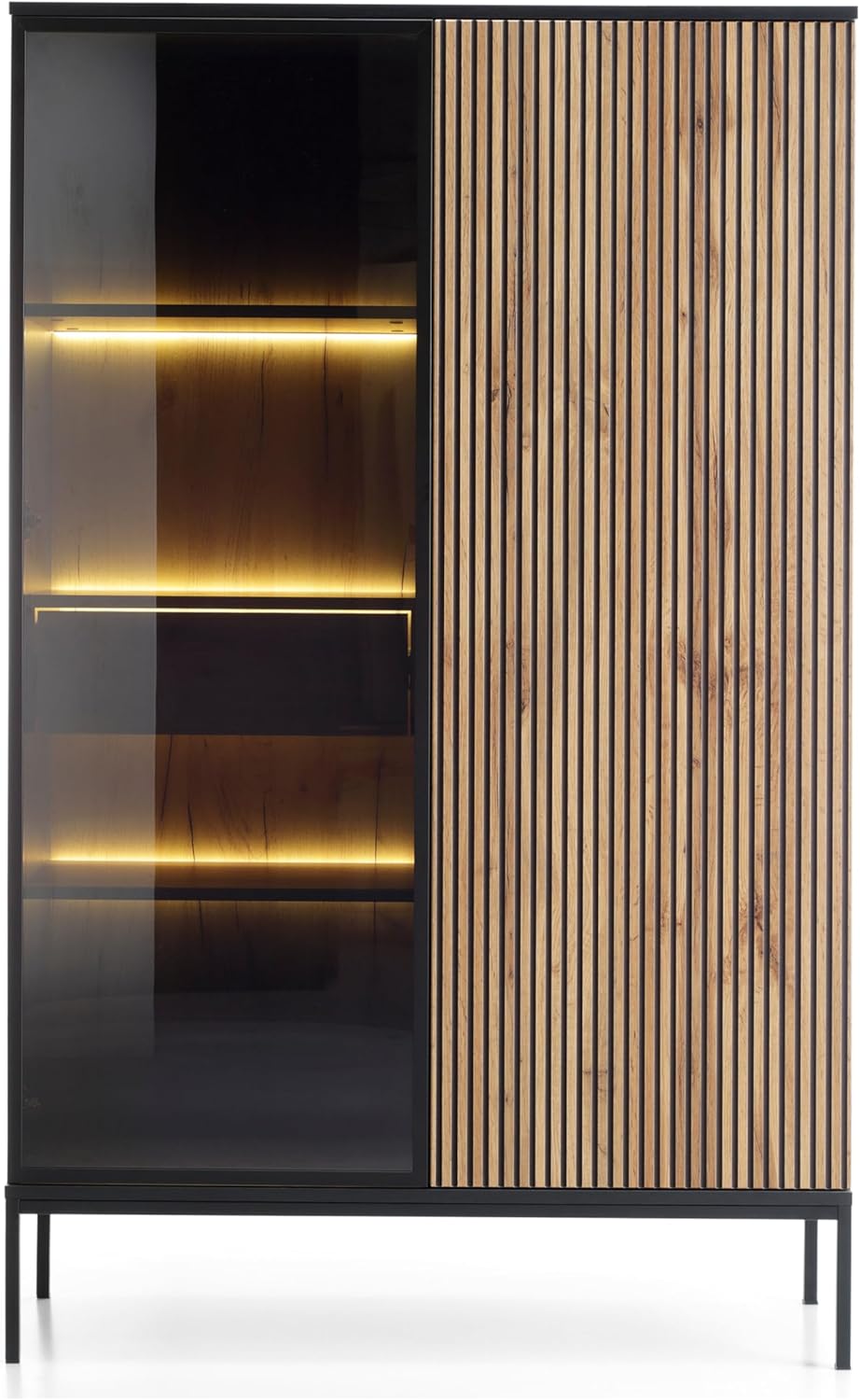 Laval WTSZ104 – Vitrine mit LED-Beleuchtung, schwarz, Eiche Wotan, Lamelle, Breite 104 cm, Höhe 166 cm, Tiefe 39 cm
