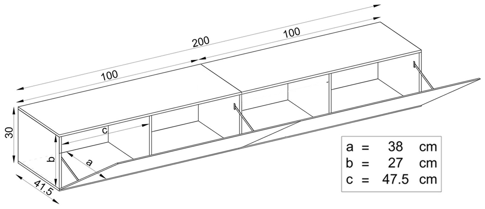 2 hängende TV-Möbel. Gesamtmaße des Sets: Breite 100 cm, Höhe 30 cm, Tiefe 41,5 cm.