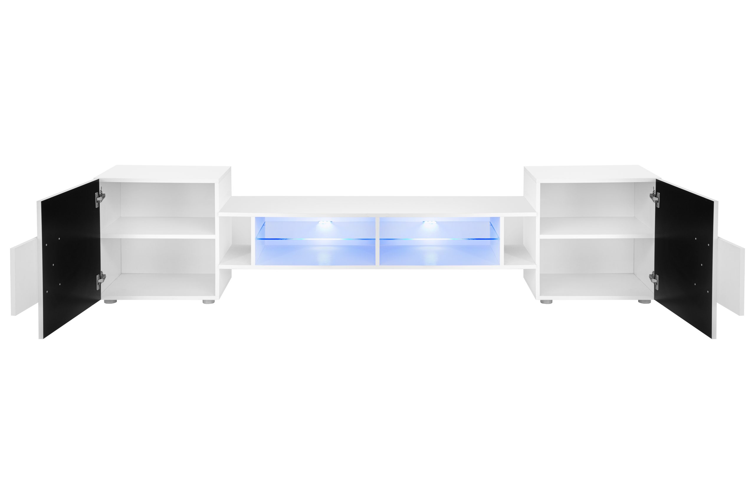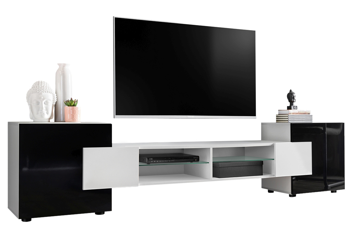 Der RTV-Schrank Merano passt perfekt zu einer Vielzahl von Einrichtungsstilen, insbesondere zu modernen und skandinavischen. Die Fronten der äußeren Schränke sind glänzend, während der Korpus und das Mittelteil matt sind.