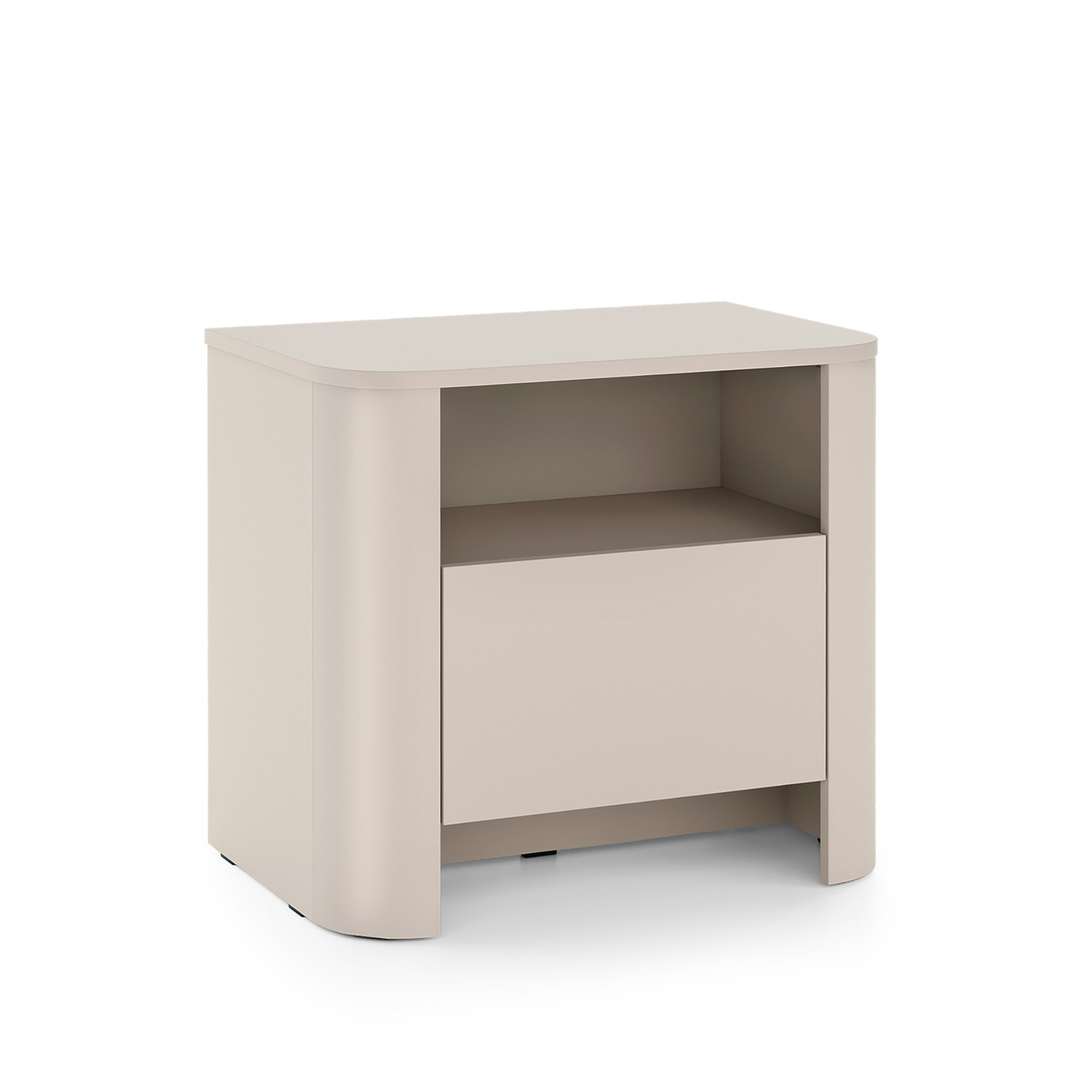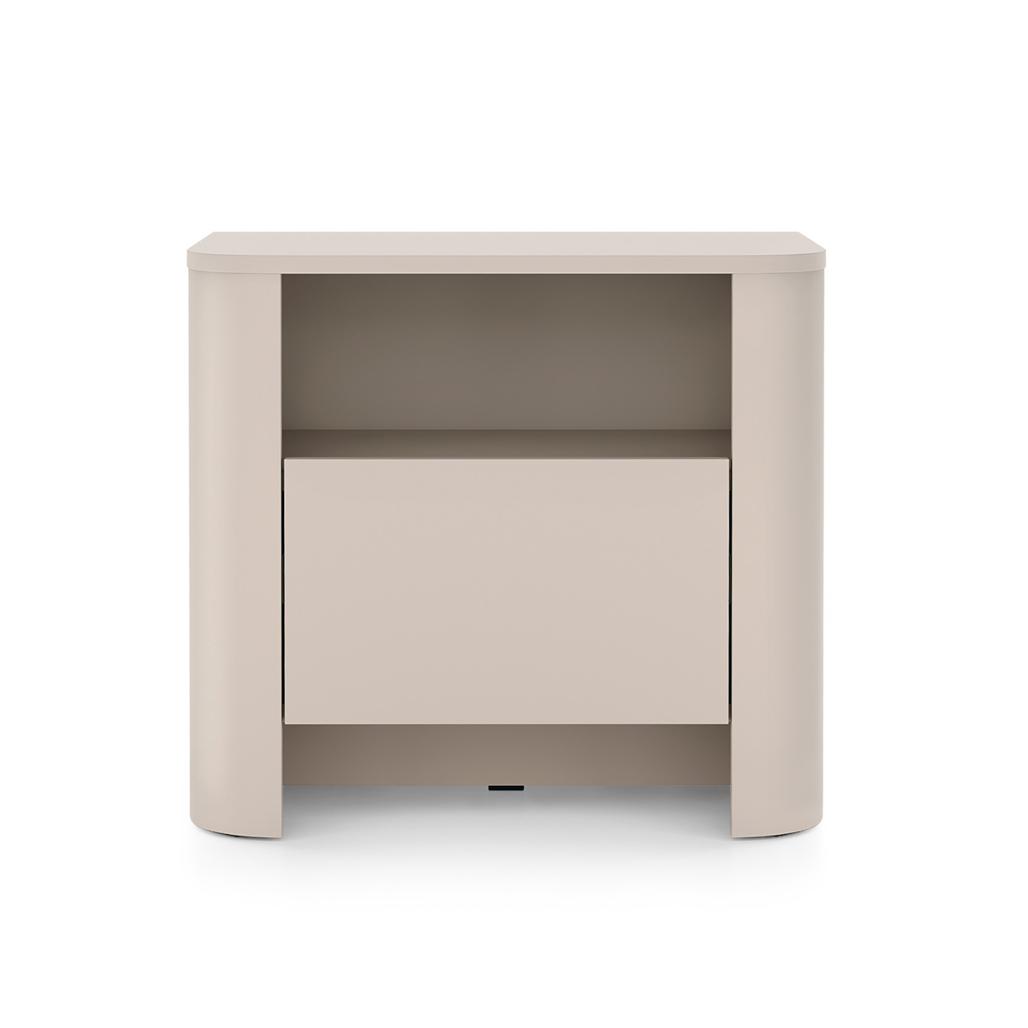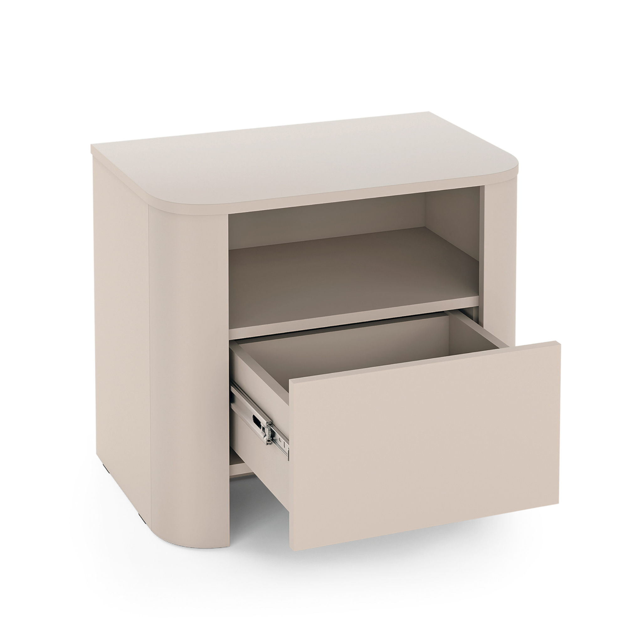 Ein charakteristisches Element sind die abgerundeten Seiten aus strapazierfähiger MDF-Platte mit einer Dicke von 18 mm, die der Form Leichtigkeit und ein modisches Erscheinungsbild verleihen. Die glatte Front betont den minimalistischen Charakter.