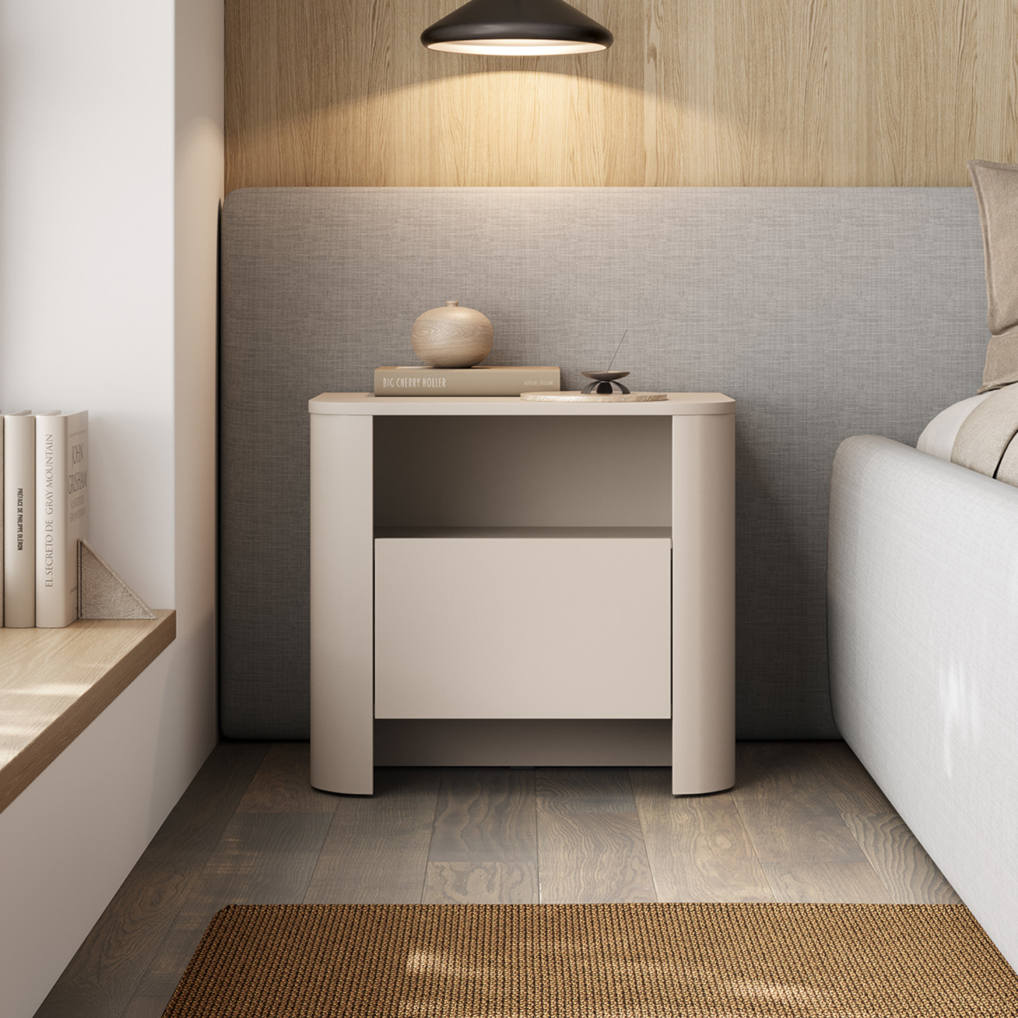 Das Möbelstück ist mit einer geräumigen Schublade ausgestattet, die alle Kleinigkeiten, die Sie vor dem Schlafengehen benötigen – ein Buch, eine Brille, ein Ladegerät oder Kosmetika – aufnehmen kann. Die Schublade wird dank des grifflosen push to open-Systems mit einer sanften Schließfunktion geöffnet, was Komfort und Bequemlichkeit im täglichen Gebrauch bietet.