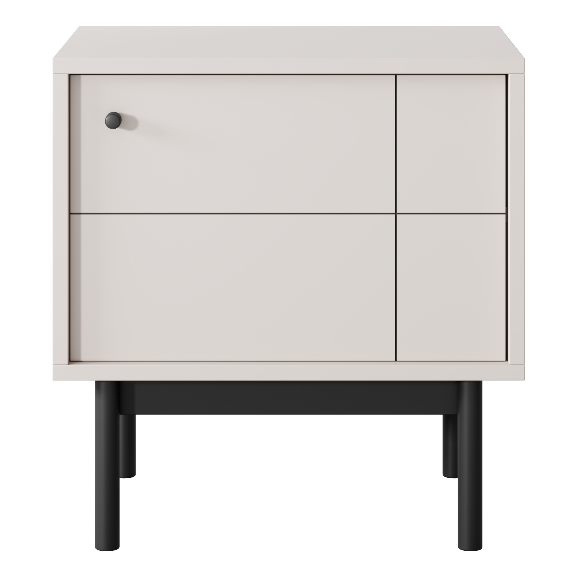Stabilität und Leichtigkeit des Designs gewährleisten die schwarz lackierten Holzbeine, während die eleganten Metallgriffe den modernen Charakter unterstreichen. Die Front ist mit einem leisen Schließsystem ausgestattet, das den Nutzungskomfort erhöht und die Konstruktion vor schneller Abnutzung schützt. Ein zusätzlicher Vorteil sind die geometrischen Fräsungen, die einen subtilen Akzent setzen und der Kommode einen einzigartigen Charakter verleihen.