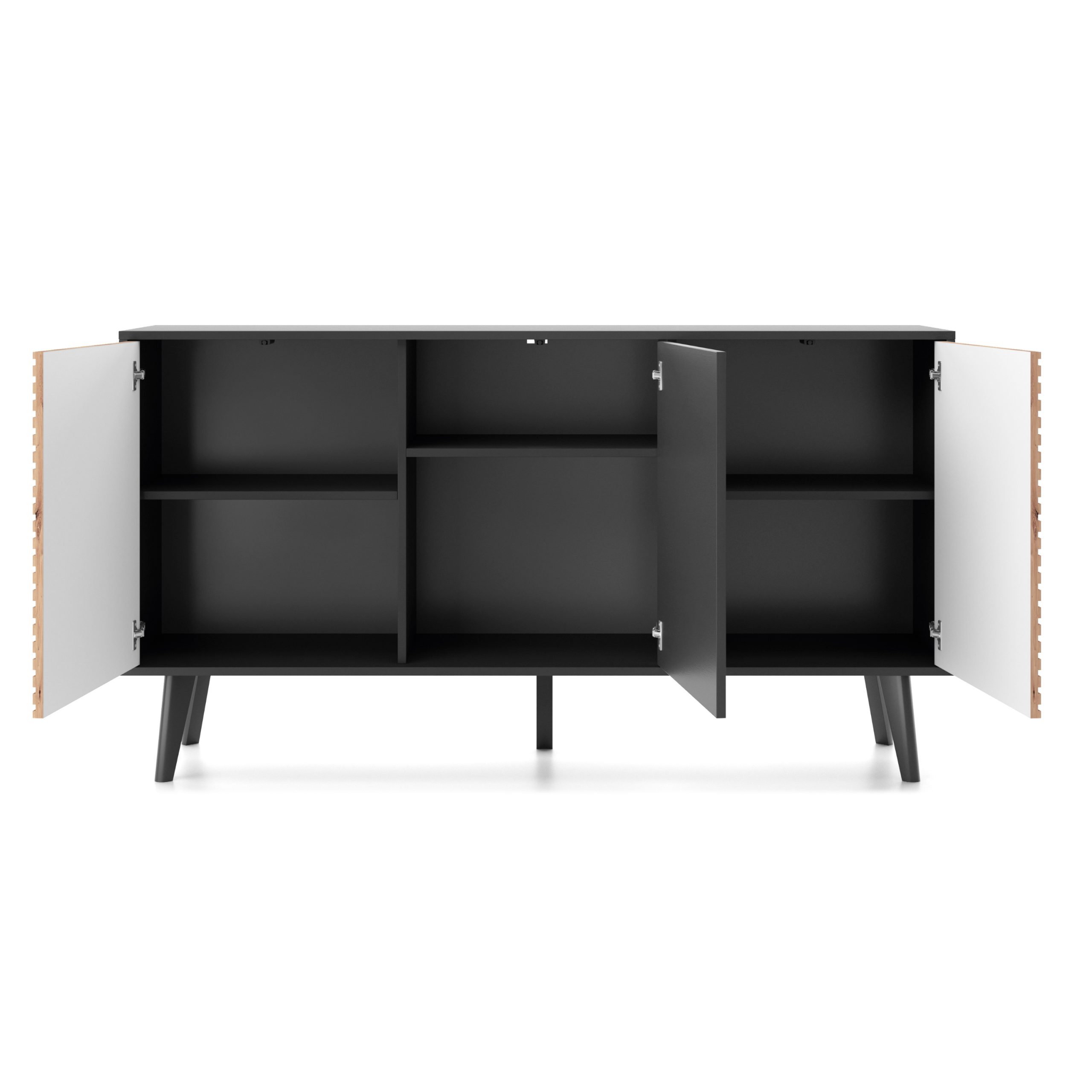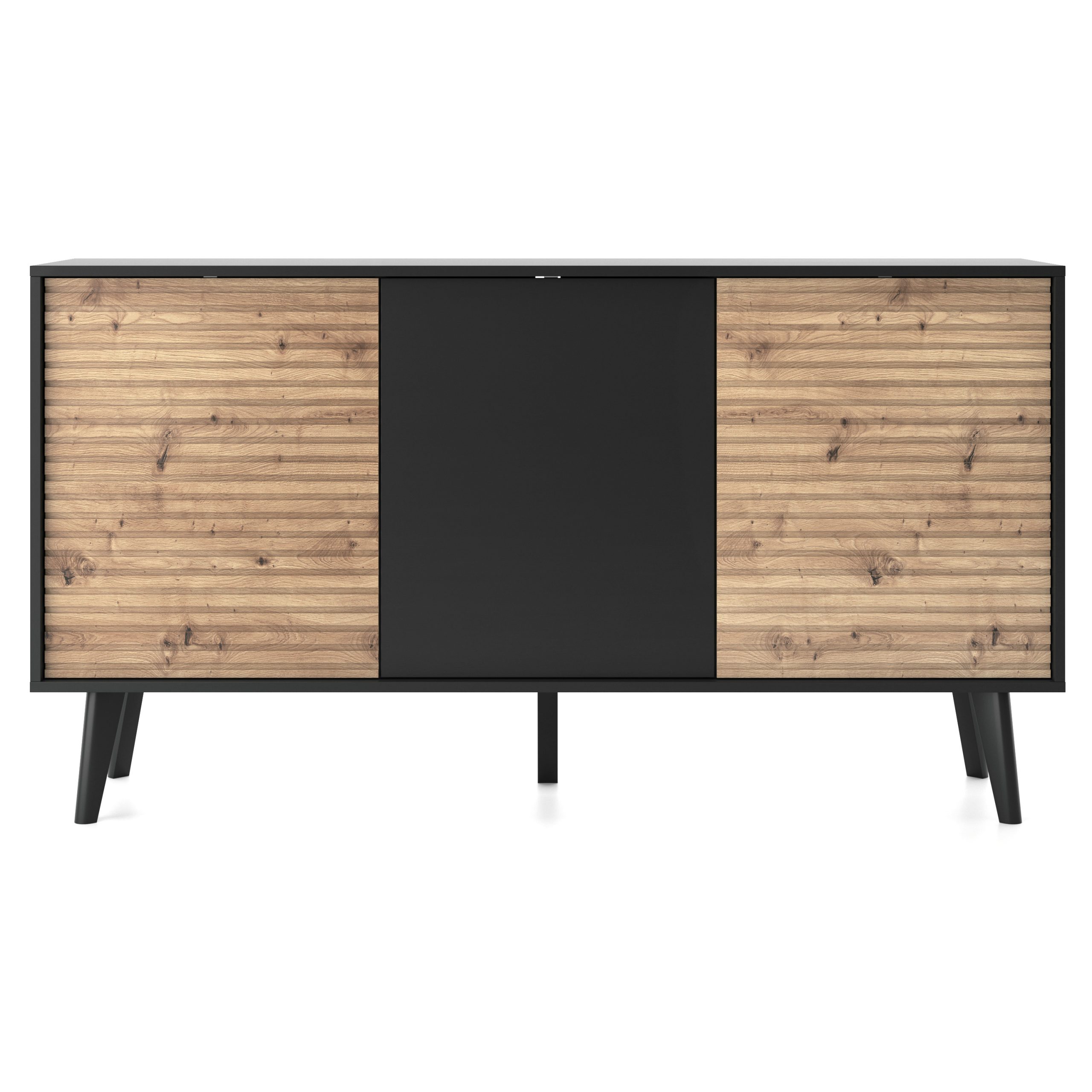Die Kommode Saskatoon K154 ist eine funktionale und elegante Lösung für das Wohnzimmer, Esszimmer oder Schlafzimmer. Ausgestattet mit drei Türen bietet er Platz für die Aufbewahrung einer Vielzahl von Gegenständen – von Textilien über Dokumente bis hin zu Geschirr. Das kontrastreiche Farbduo aus Schwarz und handwerklicher Eiche harmoniert mit der dekorativen Lamellenleiste und unterstreicht den industriellen Stil der Möbel.