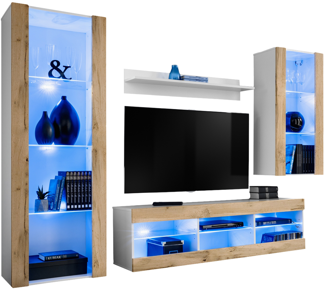 Tivoli Medio RTV Möbel Set, Wotan/Weiß LED Beleuchtung Blau