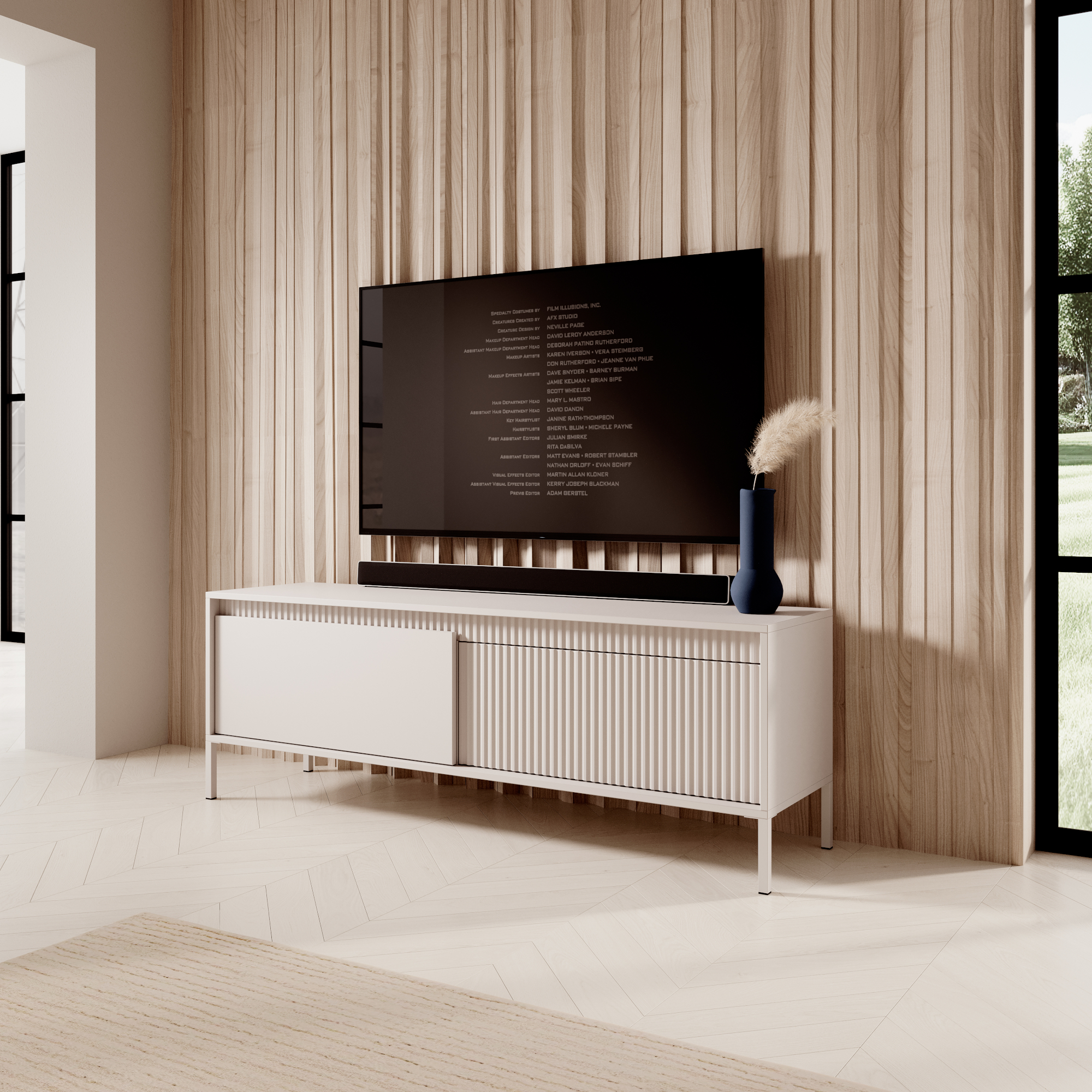 Ein charakteristisches Merkmal der Kollektion SELBU sind die modernen Riffelungen, die bei ausgewählten MDF-Fronten sowie an der Leiste unter der oberen Platte eingesetzt wurden. Sie verleihen den Möbeln ein ausdrucksstarkes und zugleich dezentes Design. Glatte, leicht hervorstehende Fronten bilden dazu einen spannenden Kontrast und betonen die moderne Formensprache der Möbel.
