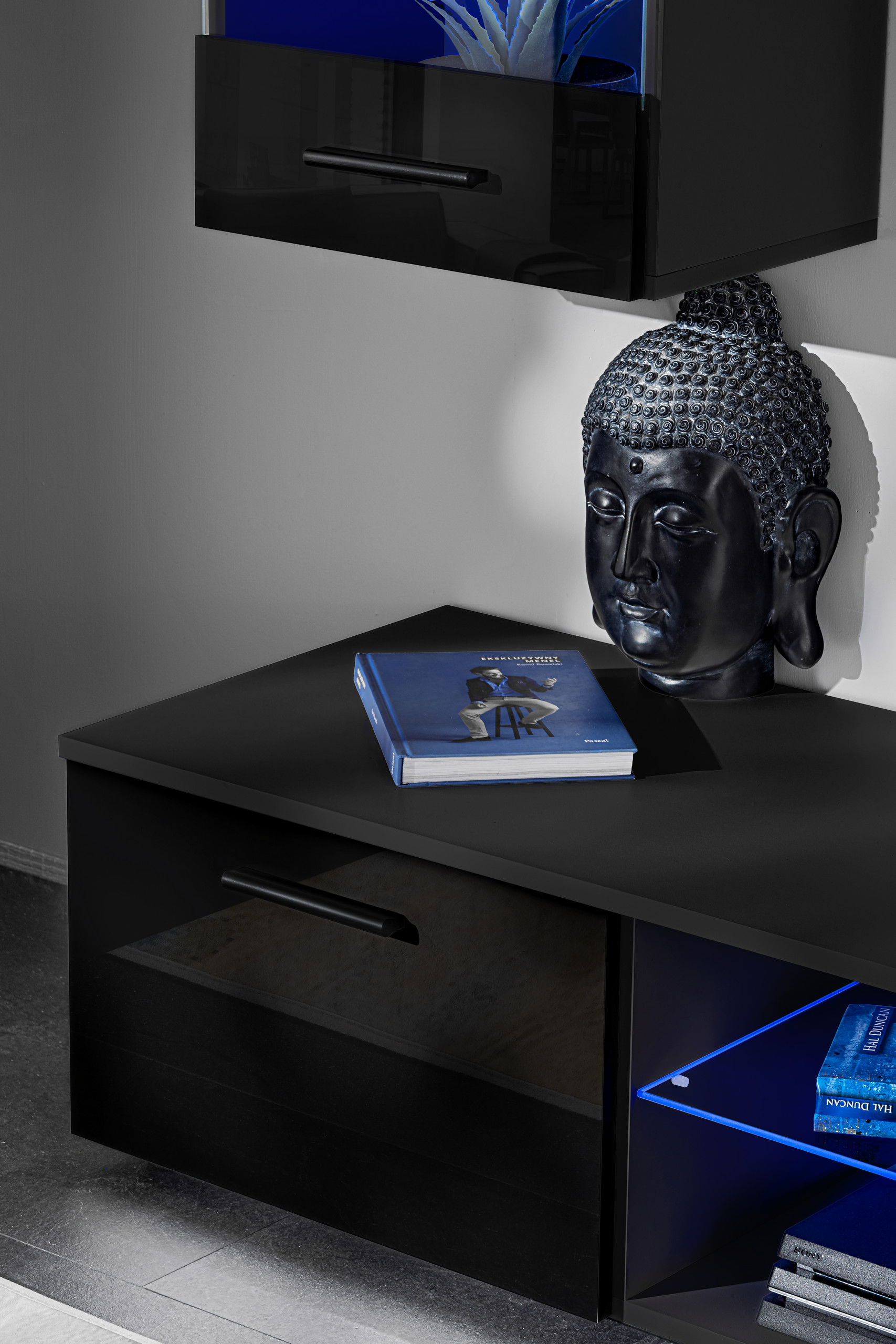 Varallo RTV Möbel Set, Schwarz/Schwarz LED Beleuchtung Blau