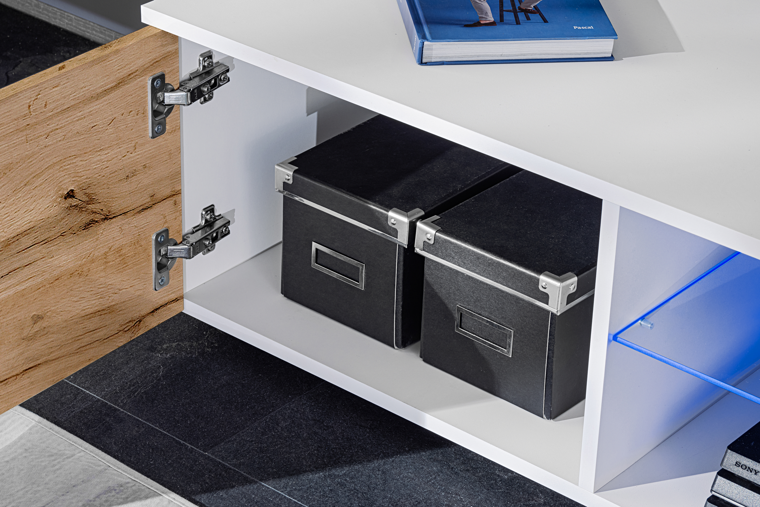 Die Möbel der Varallo-Kollektion helfen Ihnen, das Chaos im Wohnzimmer oder Schlafzimmer zu bändigen. Der TV-Schrank ist das zentrale Element des Sets – er bietet perfekt Platz für den Fernseher und die Hi-Fi-Anlage.